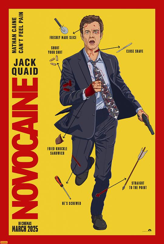 ◎标 题 无痛凯恩 ◎译 名 无痛先生(台) / 无痛侠(港) ◎片 名 Novocaine ◎年 代 2025 ◎产 地 美国 / 加拿大 / 南非 ◎类 别 喜剧 / 动作 / 惊悚 ◎语 言 英语 ◎上映日期 2025-03-13(中国香港) / 2025-03-14(美国) ◎IMDb评分 6.5/10 (65812人评价) ◎IMDb链接 https://www.imdb.com/title/tt29603959/ ◎豆瓣评分 6.2/10 (11734人评价) ◎豆瓣链接 https://movie.douban.com/subject/36618568/ ◎导 演 罗伯特·奥尔森 丹·伯克 ◎编 剧 拉尔斯·雅各布森 ◎演 员 杰克·奎德 安伯·明迪桑德 雷·尼科尔森 雅各布·贝塔隆 贝蒂·加布里埃尔 马特·沃尔什 康拉德·坎普 埃文·亨斯特 克雷格·杰克逊 小卢·比提 嘉斯·柯林斯 崔斯坦·德比尔 杰西卡·雷·斯坦利 奇奥玛·乌梅拉 玛格特·伍德 迪伦·斯可斯 基诺·李·赫克托 玛丽亚·沃斯 多米尼克·马厄 德维尔·凡尼克