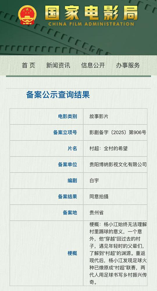 ◎标 题 村超:全村的希望 ◎年 代 2026 ◎产 地 中国大陆 ◎类 别 剧情 ◎语 言 汉语普通话 ◎上映日期 2026(中国大陆) ◎IMDb链接 https://www.imdb.com/title// ◎豆瓣链接 https://movie.douban.com/subject/37379848/ ◎编 剧 白宇
