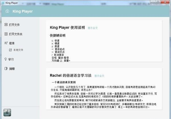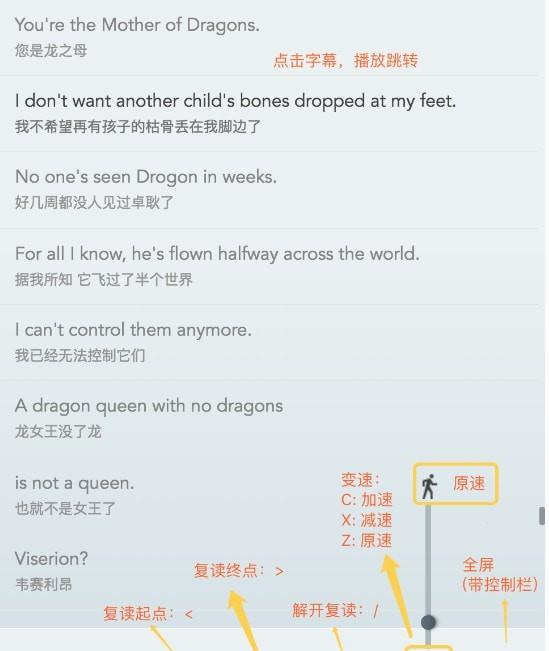 KingPlayer播放器(英语倍速复读软件) 1.0 正式版免费堂堂正正兔死春意正浓狐悲真诚是美酒,年份越久越醇香浓烈;真诚是焰火,在高处绽放才愈显美丽;真诚是鲜花,送之于人,手有余香。2.人民生活水平的显著提高/ 稳步增长the remarkable improvement/ steady growth of people’s living standard379.机关算尽太聪明,反算了卿卿性命。 KingPlayer播放器是一款英语倍速复读软件,支持断点功能可以自行设置复读次数,智能识别中英文字幕,边看美剧边学英文非常方便,可以使用快捷键进行操作,是一款视频英语学习神器。  功能介绍 1.0.5X - 4X 完美变速不变调。 2.复读的断点非常准确,不会因为速度变化而发生改变。 3.针对视频srt字幕或音频lrc歌词的各项操作: 1)可以识别中英文,你可以选择显示任一语言的字幕,或双语。 2)点击字幕,直接跳转到字幕时间处播放。 3)可设置复读次数:也就是单句复读多少次。这对于喜欢用美剧学习,却苦于难以进步的同学是一大福音。  软件截图2 使用方法 1飞机图标: 倍速。走路图标: 原速;  软件截图3 2.箭头图标: 复读。  软件截图4 3.标题处的滑动条: 如有歌词或字幕, 可滑动改变每句复读次数。 4.单击任意句子, 播放跳转到该句子处。 5.如有双语字幕: 单击标题处的『中』『英』『双』, 可以选择语言。  软件截图5 快捷键说明 c: 快速 x: 慢速 z: 原速 <: 复读起点 >: 复读终点 /: 取消复读 空格: 播放-暂停 方向键-上: 音量+ 54. 你是我的,谁都抢不走,我就是这么霸道,我是你的,谁都领不走,我就是这么死心眼。方向键-下: 音量- 方向键-左: 后退5s 方向键-右: 前进5s enter: 全屏/退出全屏 backspace: 回到主页 (Mac 上是 delete键) 音视频有歌词、字幕的情况下: 加号 + : 每句复读次数 +1 减号 - : 每句复读次数 -1 注意事项 视频目前只支持mp4 如有问题,重开一下 满庭芳 秦观绣罗衣裳照暮春,蹙金孔雀银麒麟。KingPlayer播放器(英语倍速复读软件),KingPlayer播放器(英语倍速复读软件)下载,视频播放,影音工具23、Practice makes perfect. |