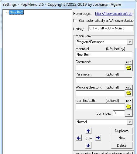 PopMenu(快速启动器) 2.7官方版免费目中无人如雷贯耳一年之计在于春16. 唯有以德报怨,把伤害留给自己,让世界少一些仇恨,少一些不幸,回归温馨仁慈友善与祥和,这才是宽容的至高境界。人们应该增加对儿童教育的重视,因为他们会在祖国的未来扮演重要的角色。161.人闲桂花落,夜静春山空。《鸟鸣涧》 PopMenu是一款迷你和简约的快速启动器,PopMenu完全免费,体积小巧,默认只有英文界面,不依赖.net或者vc++,通过系统托盘图标的菜单来管理和运行程序的,相信很大一部分人都喜欢这种快速启动器,因为它和开始菜单一样,能够容纳软件的数量众多,分类清晰,操作简单而快速,容易寻找。  软件特色 虽然这个软件十分的小,并且操作可能有些费力,但它的主要功能设计的完全不含糊,添加完程序之后还可以添加命令行参数、工作路径,也可以更改它在菜单中的显示图标,以及运行后是显示正常窗口、最大化还是直接最小化。 设置界面左下角的导入导出功能也是能够用来快速备份和恢复这些菜单。 【usb】按钮: 最后需要说明的是,你会发现设置界面带有路径的选项的文件夹图标上方都有一个【usb】按钮,这个【usb】按钮是非常有用的。 当你添加完程序之后,点击一下【usb】按钮,那么程序的路径就会从绝对路径变为以【%usb%】开头的相对路径,这会有什么好处呢? 以PopMenu运行z:\\chrome.exe为例: 当绝对路径时,PopMenu会运行位于【z盘】\\chrome.exe。 而相对路径时,PopMenu会运行位于【PopMenu所在盘符】\\chrome.exe。 也就是说,只要你把PopMenu和绿色软件放在同一个分区,利用相对路径,不管重装系统后这个分区的驱动器号变成什么名字,使用PopMenu运行同一盘符下的绿色软件都不会找不到。而通常情况下,一个快速启动器肯定是和绿色软件存在同一分区下的,56. 我希望我跟你的名字能写在一起,不管是在婚礼的喜帖上,还是在葬礼的墓碑上。而这种相对路径的优势就非常明显了。 使用说明 打开设置界面: 运行后就会看到它显示在系统托盘中,在系统托盘图标上【右击】,选择【settings】就可以看到设置界面了。 往主菜单中添加软件: 添加第一个软件非常容易,点击设置界面-【command:】右侧的文件夹图标,找到并选择指定程序的exe文件,在【Menutitel:】处手动填写软件名称,点击【ok】,就可以在系统托盘图标上【左击】显示菜单后看到这个软件了。 当你想要添加第二个软件时,在设置界面上点击【new】后重复以上步骤即可。 如果你想要一次添加多个软件,那么点击多次【new】之后,重复以上步骤即可,如果创建的太多,可以点击【delete】删除。 如何在PopMenu中创建分类菜单: 实际上这个操作和添加软件十分类似,在设置界面【Menutitel:】处手动填写分类名称,点击【ok】即可,或者可以不点击【ok】,直接点击【new】创建下一个。 如何往分类菜单中添加软件: 首先【往主菜单中添加软件】,添加成功后选择它,然后利用设置界面中的【上】、【下】按钮移动到分类菜单下方,在按下【右】按钮,这个软件就会往右缩进,成为这个分类菜单下的一员了。想要把这个项目移动到主菜单?当然是选中后按【左】后再上下调整。 如何添加分割线: 在设置界面点击【new】之后,再【menu item】的下拉菜单中选择【Separator(line)】选项即可。 所以你会发现,实际上PopMenu的添加功能大部分都是由界面上的上下左右按钮来完成的,虽然一开始可能不太明白,但掌握之后一点也不会不好用。 春讯飞琼管,风日薄,度墙啼鸟声乱。江城次第,笙歌翠合,绮罗香暖。102李白:送友人PopMenu(快速启动器),PopMenu(快速启动器)下载,桌面工具,系统工具34、Difficult the first time, easy the second. |