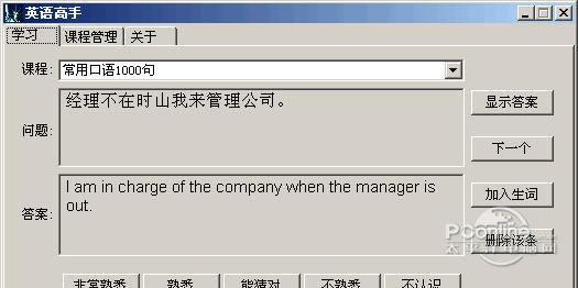 英语高手是一款模拟卡片式学习的记忆软件,将积分机制引入学习过程,软件自动评分,让学习成为轻松快乐的事情!它不仅可以用于学习英语,也可以用于其它任何科目! 难度指数或积分:4000,大致相当于大学英语四级水平,或4000词汇量,或托业550分左右;6000,大致相当于大学英语六级水平,或6000词汇量,或托业650分左右;其它类推。 课程导入:可以导入句子、单词、词组或其它任何学习资料,导入格式为UTF-8或Unicode文本格式(可使用Windows记事本打开,文件-》另存为,编码选择UTF-8或Unicode-》保存,否则将出现乱码),使用英文半角关键字Q:(表示问题)及A:(表示答案)进行区分,需要您自行设定难度指数。格式: Q:问题1 A:答案1 (这里可以加入一个空行) Q:问题2 A:答案2 英语高手截图1 寻思旧京洛,正年少疏狂,歌笑迷著。障泥油壁催梳掠,曾驰道同载,上林携手,灯夜初过早共约,又争信飘泊。舍南舍北皆春水,但见群鸥日日来。英语高手,英语高手下载,英语高手较新版Private restaurants serve gourmet food for $70 per person; incentives boosted agricultural production 25 percent and industrial output 80 percent in just three years; farmers are encouraged to raise as much as they can on their own plots, and some become almost rich in the process.(注意本句中分号的使用) |