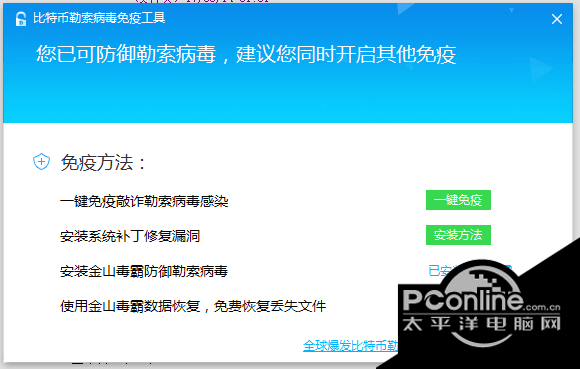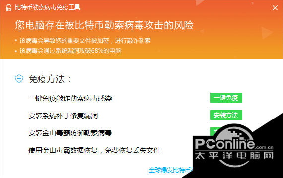 软件特色 1.极速轻巧,安全护航 2.率先拦截敲诈勒索病毒 3.操作简洁,一键查杀,勒索病毒无所遁形 使用方法 1.检测当前电脑是否有免疫比特币勒索病毒攻击,建议安装金山毒霸
