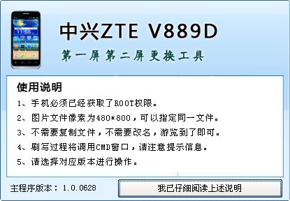 看到大家对V889D手机的第一屏和第二屏的更改这么感兴趣,且有相关软件(夜游神)可以操作,不过软件操作稍嫌复杂了些,要复制,要改名,使用不方便,特别是4.0版本由于改写了算法,和2.3的版本的更改方法不一样,有感于这些琐碎的操作带来的麻烦,本人专门写了这个小程序,且将2.3版本和4.0版本的合二为一,一个软件,全部搞定!