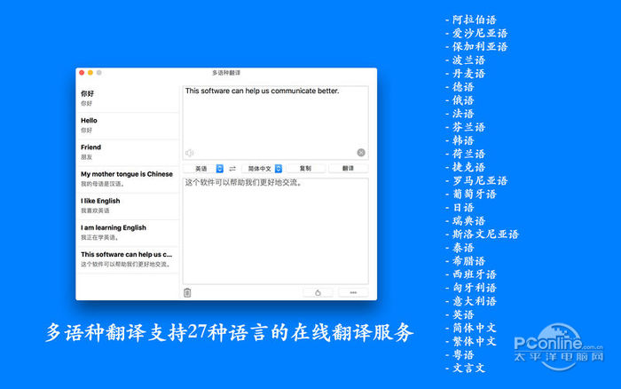 多语种翻译 Mac版 17.10.1 正式版收费有见多识广机可花样多(五花八门)乘25. 生活的海洋并不像碧波涟漪的西子湖,随着时间的流动,它时而平静如镜,时而浪花飞溅,时而巨浪冲天……人们在经受大风大浪的考验之后,往往会变得更加坚强。7. I had a great first impression of American people.396.为有牺牲多壮志,敢教日月换新天。《七律?到韶山》 多语种翻译支持27种语言在线互译 - 阿拉伯语 - 爱沙尼亚语 - 保加利亚语 - 波兰语 - 丹麦语 - 德语 - 俄语 - 法语 - 芬兰语 - 韩语 - 荷兰语 - 捷克语 - 罗马尼亚语 - 葡萄牙语 - 日语 - 瑞典语 - 斯洛文尼亚语 - 泰语 - 希腊语 - 西班牙语 - 匈牙利语 - 意大利语 - 英语 - 简体中文 - 繁体中文 - 粤语 - 文言文  多语种翻译 Mac版 截图1 多语种翻译的新功能 - 优化服务  多语种翻译 Mac版 截图2
