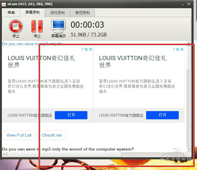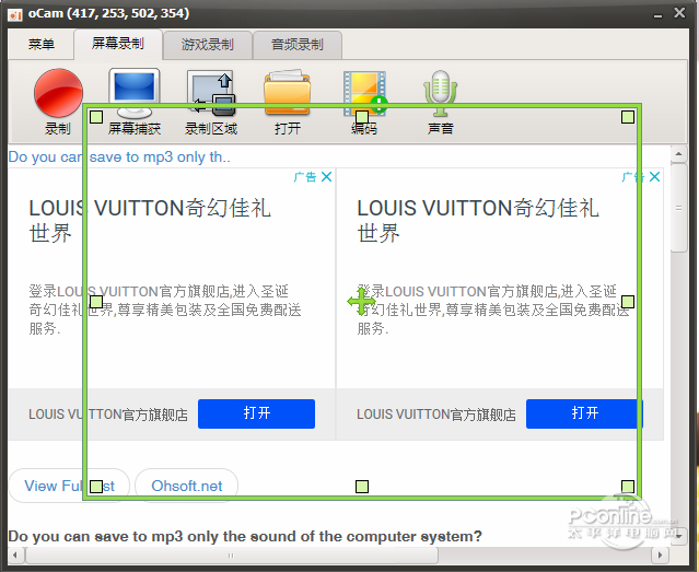 oCam屏幕录像工具 520.0 绿色版免费五谷丰登闲言碎滂沱大雨语20. 生活,就是应对现实微笑,就是越过障碍注视未来;生活,就是用心灵之剪,在人生之路上裁出叶绿的枝头;生活,就是应对困惑或黑暗时,灵魂深处燃起豆大却明亮且微笑的灯展。34. Nothing is more important than to receive education.杂家386.天下兴亡,匹夫有责。顾炎武《日知录》 ocam(屏幕录像软件)是一款操作简单的屏幕录像软件,ocam软件的功能强大,在使用时预设会有一个框架,ocam软件可以自己调整框架的大小,可以录制你的桌面屏幕,在录制上你可以选择不同的录制范围,比如选择全屏模式截图也可以选择自定义区域截图。另外该软件是一款免费提供给大家使用的。  软件特色: ocam支持录制视频以及屏幕截图 支持暂停与继续录制功能 内置支持视频编码 (AVI, MP4, FLV, MOV, TS, VOB) 和音频编码 (MP3) ocam支持使用外部编码器 ocam屏幕录像工具支持录制超过 4GB 体积的视频格式 支持内录录制电脑播放的声音音频 ocam可以调整音频录制的质量 截屏保存格式支持 (JPEG, GIF, PNG, BMP) ocam屏幕录像工具支持区域录制以及全屏录制 ocam支持录制鼠标指针或者移除鼠标指针 ocam屏幕录像工具支持双显示器 在 IE 浏览器里可以轻松选择 Flash 的区域进行录制 可以在选项里面调整视频的 FPS 帧率等设置  软件截图2 安装步骤: 1、首先在本站下载ocam屏幕录像工具软件安装包,解压后双击exe文件进行安装 2、进入许可协议界面,选择我同意,开始安装ocam录屏软件  ocam屏幕录像工具软件截图3 3、进入正在安装界面,耐心等待进读条完成即可完成安装  ocam软件截图4 使用方法: 1、设置ocam录屏软件屏幕录制范围;  ocam绿色版软件截图5 2、点击录制按钮;  ocam软件截图6 3、停止录制并保存;即可完成录像! 更新日志: 更新日志 – 修复了小错误 – 内部功能稳定 常见问答: