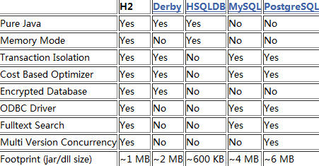 | Pure Java | Yes | Yes | Yes | No | No | | Memory Mode | Yes | No | Yes | No | No | | Transaction Isolation | Yes | Yes | No | Yes | Yes | | Cost Based Optimizer | Yes | Yes | No | Yes | Yes | | Encrypted Database | Yes | Yes | No | No | No | | ODBC Driver | Yes | No | No | Yes | Yes | | Fulltext Search | Yes | No | No | Yes | Yes | | Multi Version Concurrency | Yes | No | No | No | Yes | | Footprint (jar/dll size) | ~1 MB | ~2 MB | ~600 KB | ~4 MB | ~6 MB |