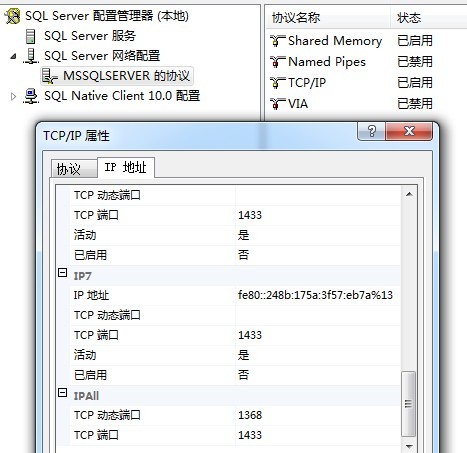 java连接sqlserver2008驱动包 正式版免费赤日炎晨光绚丽九霄云外炎36. 用心人生看到的世界是一片阳光,消极人生看到的世界是一片黑暗;用心人生感受到的生活是无比快乐,消极人生心里感觉到的仅是一丝丝悲凉。39.致力于/ 投身于 be committed / devoted to…[NextPage]357.青山依旧在,几度夕阳红。 java连接sqlserver2008一直说驱动不匹配,后来知道需要一个驱动包,找了下,果断有用啊~~分享给大家~ java连接sqlserver2008驱动包 java连接sql server2008所需要的jar,里面有4个jar包 3个是sql server 2008的驱动包还有一个是连接使用的包。 Java连接SqlServer2008数据库怎么用? 解压完成后,进入 <你解压到得目录>\\sqljdbc_3.0\\chs,里边有两个我们需要的东东 一个是:sqljdbc.jar,另外一个是sqljdbc4.jar 这里使用sqljdbc4.jar 首先配置sa身份验证: 由于安装sqlServer2008时是以windows身份验证安装的,并没有为sqlServer2008添加sqlServer身份用户,因此首先添加用户: 打开Microsoft SQL Server Managerment Studio并以windows验证方式登录,左侧的对象资源管理器->安全性->登录名,右击sa->属性,为sa用户添加密码,选择sqlServer身份验证,在"状态"选项中授予连接到数据库和登录启用.右击对象资源管理器的根节点,选择属性->安全性->sqlServer和windows身份验证模式,这样就为sql server 2008创建了以sql server身份验证的用户sa. 在java代码中用两种方式连接sqlserver2008数据库,一种是sa身份验证模式,另外一种是混合身份验证模式: 第二种:混合身份验证模式,用上边java代码的url2. 在集成模式下需要如下操作: 找到你刚才的解压目录:进入sqljdbc_3.0\\chs\\auth\\x64,我的是64位系统,如果是32位就x86,将一个名为sqljdbc_auth.dll的文件拷贝到:C:\\Window24. 简单安静的生活其实不幸福,所以我只拥抱刹那,绵延持久的感觉根本不快乐,所以我只信仰瞬间。s\\System32下,就好了 最后就是sqlserver2008用的是动态端口,需要你配置一下: 打开配置工具->SQLServer配置管理器->SQLServer网络配置->MSSQLSERVER的协议->TCP/IP启用,把TCP动态端口中的0都删掉,留空;然后把列表拉到最下边(IPALL),配置一个固定端口,以后你连接数据库就用这个端口就可以了:如下图  这里我用的是1368,数据库重启后,就可以用上面的程序连接了. 东风第一枝 史达祖望君烟水阔,挥手泪沾巾。java连接sqlserver2008驱动包,数据库7、What is done cannot be undone. |