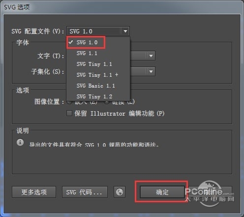 第十步:在弹出的选项中配置文件选择SVG1.0,点击“确定”