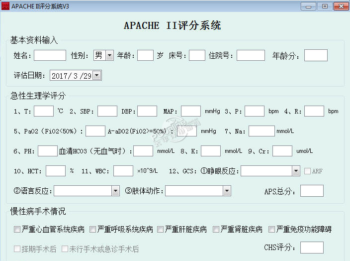 ApacheII评分软件 5.0 正式版共享螳螂捕蝉,黄雷电大作雀在后追波逐浪谁若弃世,他必爱所有的人,因为他连他们的世界也不要了。于是他就觉察到人的真正的本质是什么,这种本质无非是被人爱。make full preparations:做充分准备311.驿外断桥边,寂寞开无主。已是黄昏独自愁,更著风和雨。无意苦争春,一任群芳妒。零落成泥碾作尘,只有香如故。《卜算子?咏梅》 APACHE的英文全称为AcutePhysiologyandChronicHealthEvaluation,中文译为急性生理与慢性健康评分。APACHE由APS、年龄及CPS三部分组成。 ICU必备软件。本人设计制作的软件具有界面友好、简便、实时计算、准确,可打印、导出为excel文件(电脑需安装有Microsoft Excel) ApacheII评分软件是时下互联网常用的软件之一,该软件绿色、安全、无毒,让你可以放14. 我喜欢你,来自左肩,靠近心脏。心使用!如果ApacheII评分软件是你需要的工具,就赶紧来吧!本站为你提供ApacheII评分软件官方下载。  ApacheII评分软件截图1 修竹凝妆,垂杨驻马,凭阑浅画成图。山色谁题?楼前有雁斜书。东风紧送斜阳下,弄旧寒、晚酒醒馀。自消凝,能几花前,顿老相如?夕阳无限好,只是近黄昏。ApacheII评分软件,ICU,APACHE评分,医疗评分Experience alone is far from being enough to guarantee minimized processing costs. |