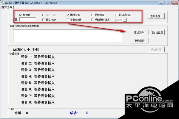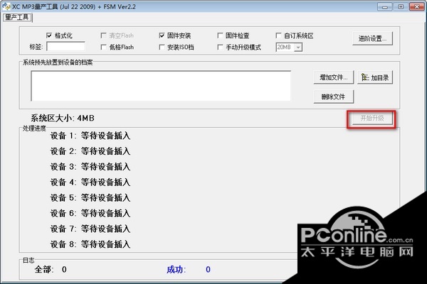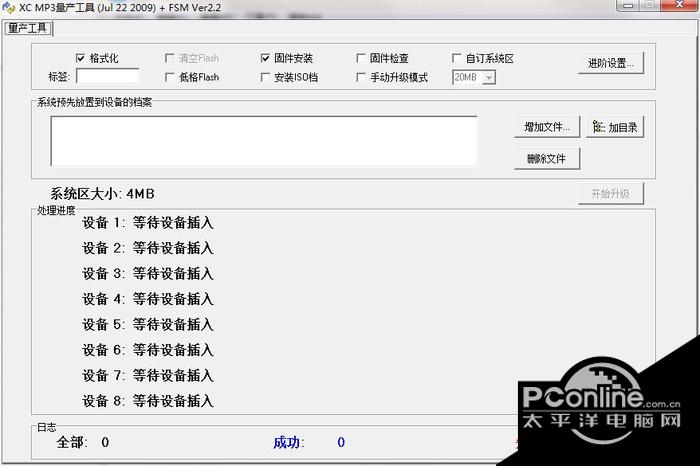 XC MP3量产工具功能介绍 只要采用LD2088主控的MP3产品都可以使用,不限制品牌,当你的mp3出现任何故障的时候都可以使用本量产工具来修复,比如 不能开机,不能进入界面等,其原理就是升级固件来达到修复,这个版本不但有量产工具,还含有通用的五键有录音有FM的固件供直接使用 XC MP3量产工具使用方法 一、下载打开软件,首先插入要修复的MP3。 二、勾选上面的格式化和固件安装固件检查功能,点击增加文件,选择软件中自带的两个固件。 三、点击开始升级即可。 XC MP3量产工具安装步骤 1.在太平洋软件园下载XC MP3量产工具官方版的安装包 2.下载后,将压缩包解压到以此软件命名的文件夹内 3.打开文件夹,双击“exe”程序 4.XC MP3量产工具为绿色软件,无需安装即可使用 XC MP3量产工具更新日志 1. 优化的脚步从未停止! 2. 更多小惊喜等你来发现~