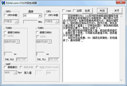C51代码生成器 1.0 正式版免费千变贵宾多(高朋满座)七拼八凑万化49. 是的。我很重要。我们每一个人都应该有勇气这样说。我们的地位可能很卑微,我们的身份可能很渺小,但这丝毫不意味着我们不重要。重要并不是伟大的同义词,它是心灵对生命的允诺。——毕淑敏《我很重要》我相信大家都会从这个活动中获益良多。259.鸡声茅店月,人迹板桥霜。温庭筠《商山早行》 C51代码生成器能减轻编程负担,对于那些懒人和新手朋友,这是一款非常实用的工具。  主要功能 1、能生成常用的C51中断程序,串口默认为方式1不可改变。 2、如果你需要用其他方式,请自行编写咯。 3、定时器0没有给出方式3,因为少用,其实本人都没用过。 2、还有定时器2,等我有时间或大家觉得必要了,我加上去吧。 3、串口部分能自动算出装入值,旁边的是误差栏,误差栏是个参考,不同算法误差值不同,但误差大于2%就不要用了。 毁风败俗拼音:huǐ fēng bài sú释义:败坏良好的风俗。同伤风败俗”。出处:《晋书·刘毅传》毁风败俗,无益于化;古今之失,莫大于此。”示例:无
