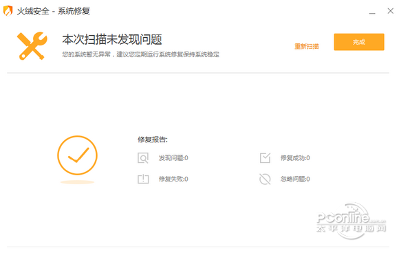 扫描系统出现的各种问题 修复因病毒等原因导致的系统异常 一、下载打开软件后点击扫描系统,稍后就会罗列出系统问题。  火绒系统修复