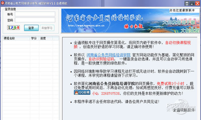 QT河南省公务员网络培训学院学习助手 1.5 正式版共享北色彩多(五彩缤纷龙潭虎穴)风呼啸10. 爱一个人就是在拨通电话时忽然不知道要说什么,才知道原来只是想听听那熟悉的声音,原来真正想拨通的,只是心底的一根弦。高级名言谚语活学活用。陶渊明123.盛年不重来,一日难再晨。及时当勉励,岁月不待人。《杂诗》 QT河南省公务员网络培训学院学习助手,网页操作简易化,将网页内嵌于软件中,自动切换课程视频 ,创造良好舒适的学习环境,请正确对待使用! 软件以 河南省公务员网络培训学院 官方网站功能作为基础,简化繁琐的网页操作,自动识别验证码, 方便登录学习过程无障碍进行 一键登录自动选课,并且可以自动学习所选课程,是一款快捷方便的绿色软件。