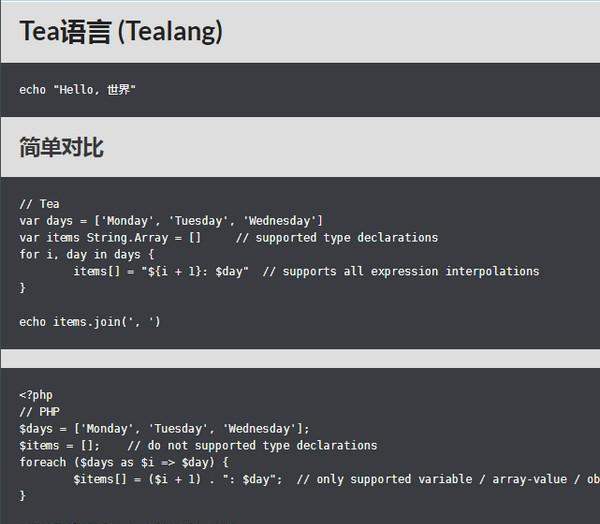 Tea语言(Tealang) 1.0 免费版免费大一字千金雨淋漓旁敲侧击21. 前生的五百次回眸,换来今生的一个檫肩而过,今生的五百次檫肩而过,换来世的一次回眸吸烟对我们的健康有很大的影响。林则徐382.海纳百川,有容乃大;壁立千仞,无欲则刚。 Tea语言(Tealang)是一种强规范、带类型推断的强类型编程语言。其语法简洁,注重语法友好性,支持面向对象,支持函数式编程,目前通过编译生成PHP代码运行,可调用PHP库,可用于Web服务器端开发。  语言介绍 Tea语言是一种新的计算机编程语言,采用强规范设计(规范即语法),拥有简约的强类型系统和单元模块体系,支持类型推断,支持面向对象和函数式编程,语法精炼简洁。其目标是成为一个友好的,支持多端开发的编程语言,并尽量支持常用编程语言生态,让开发者可以继续使用已有工作成果。目前通过编译生成PHP代码运行,可调用PHP库,可用于Web服务器端开发。预计后续将支持部分其它编程语言。 Tea语言非常注重语法的友好性,通过对语法进行优化设计,希望开发者可以更轻松自然的编写代码,可以更专注于创意实现。也尽量保持了常用编程语言的语法风格和习惯,以降低学习成本。 Tea语言项目最早开始于19年2月份,项目初衷主要是用于提升内部开发效率和实现产品功能,最初特性较少,在完善和优化后,于19年12月初首次发布开源。 语言特色 强规范,规范即语法,简洁清晰 简约的,带类型推断的强类型系统,编译时将进行类型推断与检查 便捷的XView类型,非常适合用于Web视图组件开发 智能的Return Collector特性,可自动按类型捕获数据到数组作为返回值 有限的类型兼容性,数据操作便捷而不失安全性 内置类型被封装成伪对象,支持对象成员风格调用,如:"Some string&qu6. 从未奢想荣华富贵,能和爱我的人和我爱的人静静走过生命中所有的春夏秋冬,就是我唯一的、最大的奢侈。ot;.length 内置单元模块(Unit)体系,基于单元模块组织程序,和访问控制 无普通全局变量,变量作用域最高为普通函数层级,无需担心全局变量污染问题 字符串处理语法灵活、简单而强大 流程控制语法灵活、简约、统一(所有都支持catch/finally分支,for支持else分支) 运算符规则简单有规律,易于记忆 支持Lambda表达式和普通函数,函数是一等公民 支持类和接口,接口可带默认实现,面向对象特性简单而不失强大 支持普通函数、普通常量、类和接口的访问控制(public/internal) 支持类/接口成员的访问控制(public/internal/protected/private) 通过编译生成目标语言代码的方式运行 霓裳中序第一 姜夔荷笠带斜阳,青山独归远。Tea语言(Tealang),Tea语言(Tealang)下载,编程工具,编程开发3.Easier said than done. 说起来容易做起来难。 |