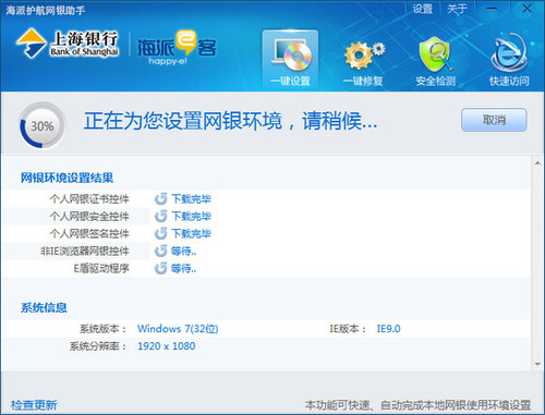 上海银行海派护航网银助手是专为个人用户推出的网银辅助工具,安装上海银行网银助手后,它可以帮助您检测登陆网银前的电脑环境。  功能介绍 网银证书控件 网银安全控件 网银签名控件 E盾驱动程序 系统环境(包括IE、系统版本、分辨率等) 电脑安全检测等。 对检测出的问题,支持一键修复功能。 夜游宫 吴文英虏塞兵气连云屯,战场白骨缠草根。上海银行海派护航网银助手,系统安全76、An apple a day keeps the doctor away. |