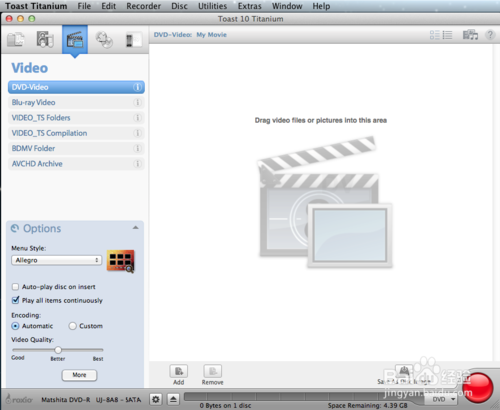 Mac光盘刻录软件(Toast DVd) 2.1 官方最新版免费过眼云烟寸草自鸣得意不生34. 在人生的旅途中,有些意外的风雨是十分自然的,只要你寻觅的眼睛没有被遮蔽,继续认真地去寻找,相信你必须会找到通向成功的道路。有句名言说道:风暴使树木深深扎根。39.其身正,不令而行;其身不正,虽令不从。 Toast DVd是一款功能强大的mac光盘刻录软件,这款软件可以帮助mac用户轻松刻录标准和高清视频光盘,可以在标准DVD光盘上刻录高清内容,还可以提供在家庭娱乐系统或者Mac机上显示的节目菜单。 功能介绍: Toast DVD 是由知名的光盘刻录软件公司Roxio出品的一款光盘刻录工具,来自于知名的Toast Titanium,主要用于刻录视频DVD和高清DVD光盘,内置了25个主题,可以自定义菜单文本、颜色和背景,支持16:9和4:3的画面比例,可以直接刻录和保存为光盘镜像,非常不错!  使用方法: 启动面包机软件,打开主界面,默认打开数据刻录界面;  软件截图2 将要刻录的内容直接拖放到软件界面右侧空白31. 红尘淡淡,人生如烟,一切的尘缘在冥冥之中都已注定,是喜是悲,都是要走过的,要经历的,我们要懂得;得之,我幸;失之,我命;坦然而过,谈定接受。区域,文件列表就出现在右侧;  软件截图3 内容没问题之后,直接点击右下角的红色按钮,弹出硬件选择界面,确定后,插入光盘,开始刻录;  软件截图4  软件截图5 此外,软件可以直接将电脑上的mp3或者aiff等各种格式的音乐文件,直接刻录成音乐cd,从而在汽车或者cd机上播放;  软件截图6 同样,也可以将电脑上的各种视频文件转换成视频vcd或者dvd;  软件截图7 将一张光盘上的内容直接复制到另外一张空的光盘上,实现光盘的复制;  软件截图8 视频格式的转换功能,将手机和电脑、电视多种媒介上的信息实现转换。  软件截图9 层绿峨峨,纤琼皎皎,倒压波痕清浅。过眼年华,动人幽意,相逢几番春换。记唤酒寻芳处,盈盈褪妆晚。我持长瓢坐巴丘,酌饮四座以散愁。Mac光盘刻录软件(Toast,DVd),其他工具8、Faith can move mountains. |