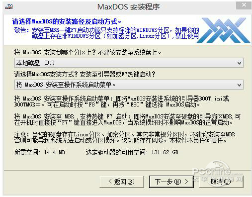 | 介绍 | MaxDOS 9.3 全能装机版免费想得很多(左铁呼啸而过树开花思右想)47. 青春犹如方糖,对吧?有棱角的,易碎的,荒唐的,甜蜜的。这种甜蜜是要亲身用舌尖的热量才能融化,才能品尝,你总不能隔岸观火。make suggestions on 对……提出建议13.天作孽,犹可违;自作孽,不可活。 MAXDOS工具箱是一个DOS工具,MaxDos工具箱的原理是利用Linux环境下的开源软件Grub之Windows版(Grub4Dos),在Windows下加入Dos的引导文件,并修改引导区,使其出现进入Dos的选项。MaxDos工具箱还集成中文输入支持以及NtfsDos等Dos常用的东西。太平洋下载中心为您提供maxdos官方下载。 ![]() MaxDOS截图1 软件特色: 1, MAXDOS为装好的Win2K/XP/2K3/VISTA/2008/7 系统加入DOS,方便维护与备份还原. 2, MaxDOS官方版支持进入DOS时设置密码,密码采用MD5加密,支持启动时热键 F7 启动. 3, MAXDOS内置约300种网卡驱动,实现GHOST自动网克及DOS下访问局域网的共享资源. 4, 全中文的菜单式操作方式,易上手,支持DOS下显示中文及五笔拼音=输入. 5, 完全傻瓜化的网刻模式,懂的基本WINDOWS操作,就能快速实现网络刻隆. 6, MaxDos工具箱支持引导自已制作DOS IMG镜像,以及支持直接启动硬盘上的光盘ISO镜像. 7, 全中文全自动化一键备份还原程序,可直接在WINDOWS上操作备份及还原. 8, MAXDOS支持系统盘为NTFS分区,支持读取,修改,删除,复制或操作NTFS分区内容. 9, MaxDos工具箱内置软件如:WIN系统密码清除,DISKGEN、SPFDISK、Ghost11、Memtset和PQ等. 10,支持DOS下驱动SATA,SCSI,1394,USB,PCMCIA等设备,可直接DOS下访问. 11,MaxDos工具箱首家全面支持nVIDIA全系列网卡网刻,更多精采内容请查阅“说明文件” 安装步骤: 下载MaxDOS工具箱,解压压缩包,双击.exe文件,阅读许可协议,选择同意, ![]() MaxDOS截图2 点击【高级安装】,选择软件安装位置、安装方式,进行下一步, ![]() MaxDOS截图3 如图,设置相关内容,进行下一步, ![]() MaxDOS截图4 开始安装软件,耐心等待, ![]() MaxDOS截图5 安装完成,注意,这里有附加任务,请自行选择。 ![]() MaxDOS截图6 使用方法: 1. 重启电脑,开机后会出现有至少两个启动选项,按向下的箭头,选择maxdos选项,回车。 2. 进入maxdos界面,选择:运行maxdos。 ![]() MaxDOS截图7 3. 进入首菜单。鼠标移动选择:c:备份还原系统 4. 进入菜单后,选择:3.启动ghost手动操作; 5. 移动鼠标,定位到To image,点击; 6. 选择你准备备份的系统分区,一般都是第一个,可以根据分区的大小来确定是否为系统分区。 ![]() MaxDOS截图8 7. 选择要保存备份的硬盘,单硬盘只有一个,双硬盘就是两个,要看清楚。选中后,点击ok; 8. 点击ok后,进入到该硬盘的分区,也就是选择要存放备份的分区;只要不是在系统盘就可以。 9. 选择分区后,在filename处写上你的备份名称:比如:fangzhou——xp-2008.04.15.GHO,然后点击save; 10. 开始备份前,会提示你,是否对备份进行压缩,no——不压缩;fast——快速压缩;High——高压缩比。选择fast就可以,high压缩比较慢,而且备份文件也不会小多少。 11. 完成后,会提示你是否检查备份的完整性,然后退出就可以。 ![]() MaxDOS截图9 更新日志: 1.更新DISKGEN 4.0支持无损分区调整,具备复制删除NTFS分区中的文件(含中文)功能。 2.更新引导器为最新版本,提高兼容模式,更新一键引导代码,提高兼容模式。 3.增加快速安装功能,只需一步即可完成安装,无须旧版本的繁琐设置。 4.安装程序智能判断存放备份分区,当最后分区小于2G时自动设定19. 我的心曾是一座孤岛,寸草不生,你来之后,花木繁盛。为其它分区。 5.依旧保存高级安装功能,老玩家可使用高级安装功能自行设置安装参数。 6.修复9.2版菜单中引导WIN7或WIN8系统失效问题。去除DISKGEN2.0版。 7.修复9.2菜单中引导我的镜像,引导ISO镜像,启动PE中的错误:当镜像文件未存放在。MAXDOS安装分区时会造成引导失败,修复后可放置在任意分区根目录均能正常引导。 8.改进程序升级机制,防止升级出错,更新MEMTEST内存测试程序为5.0版。 9.增加智能菜单功能,当自定义镜像或PE镜像不存在时自动隐藏对应的菜单项。 10.增加一键备份恢复功能可替换GHOST核心功能,可自行更换为任何版本GHOST核心。 11.增加自动修复程序运行出错或中断引起的错误,及增加错误代码功能以便查询解决。 12.规范启动设置中的项目命名及功能项设置后自动标识为是否被设置,方便查看。 13.增加在自动开始执行操作前倒计时提示,以便误操作可返回,增加被恢复分区提示。 14.增加:还原我的镜像功能可直接读取并自动识别ISO镜像中的.GHO文件,且进行自动恢复,无须再解压或虚拟后操作。并能自动过滤小于100M的GHO镜像,避免误恢复。 15.还原我的镜像功能可直接恢复移动设备上的镜像文件,无须再复制进本地分区后操作。 16.支持网络上下载虚拟光盘.ISO及兼容其它一键恢复程序的备份文件如GGH、GHS等。 17.增加更美观及实用的安装界面UI,优化并精简全自动备份及恢复的操作代码。 18.支持WIN7、WIN8及64位版系统,并能自动处理WIN7、WIN8系统中的系统保留分区。 常见问答: 1、MAXDOS工具箱怎么在gho文件里彻底删除? 答:ghost 之后,打开文件夹选项,钩除 隐藏系统文件,打开显示文件。 在C盘。删除 maxdos 目录,mxldr mxldr.mbr 这两个文件, 下载,BOOTICE 根据系统版本打开相对应的程序,编辑BCD,删除 maxdos 的启动项。 完工。 PS,不要在gho 文件里面删除maxdos 这个东西,因为gho 根目录下没有,只有在 runone 里面才有,因为这个和系统封装的流水线有