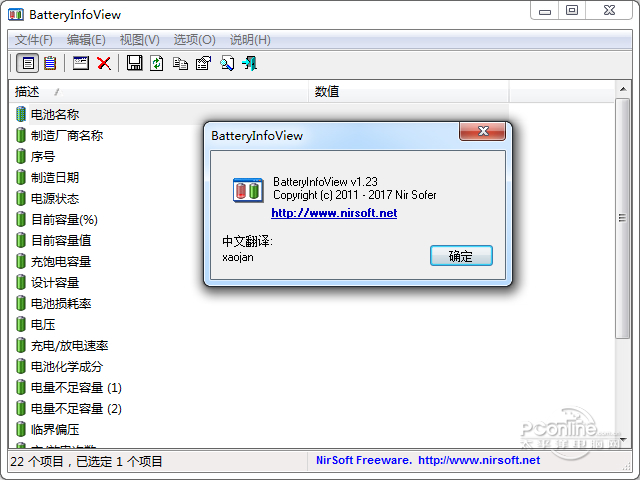BatteryInfoView笔记本电池检测软件 1.20 绿色版免费按图关怀备明眸皓齿至索骥32. 一本好书胜过珍宝,一本坏书比一个强盗更坏。’因此,开卷是否有益,得先看开什么卷。药吃了对身体有益,但也有副做用。读书是有益的,但也有糟粕。有位哲人曾说过,能够摄取必要营养的人,比吃得很多的人更健康。同时,真正的学者往往不是见书就读的人,而是会读书的人。应阻止人们往河里扔脏东西。《孙子兵法》66.知己知彼,百战不殆。 BatteryInfoView笔记本电池检测软件可全方位查看笔记本电池的状态,软件为汉化版本、方便使用,绝对比本本自带的电池管理程序给力。这款笔记本电池检测工具可显示的信息包括电池的名称、序列号、生产名称、生产日期、电源状态(充电/放电)、完全充电容量、电压、目前的电池容量、充电/放电率等。太平洋下载中心为您提供笔记本电池检测软件免费下载。  笔记本电池检测软件截图 软件特色: 提供了一个日志窗口 增加了一个新的记录行包含电池状态 每30秒或任何其他时间间隔选择 可全方位查看笔记本电池的状态 软件为汉化版本,方便使用 绝对比本本自带的电池管理程序给力