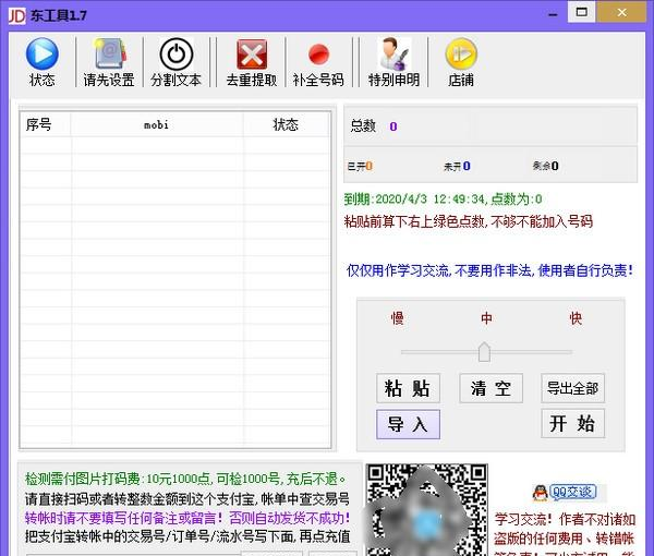 东工具是一款京东号码检测工具,可以批量检测手机号是否开通京东,检测速度快,可以进行手机号过滤,使用非常方便,对于有需要的用户来说,是一款很方便的工具。  基本简介 京东新老号批量检测软件可以批量检测手机号码是否开通京东。京东检测开通,京东筛选,京4. 赶快让情绪好起来吧,你看就连这天的阳光都如此明媚灿烂,都在发奋为你驱逐烦恼焦躁,期望你灰暗的情绪在此刻明亮起来,去迎接完美的明天!东手机号码过滤,手机号有无注册京东,准确高效。供学习交流使用。软件免费,自己注册一个帐号,登录。充值图片码钱即可。导入一行一个的号码完成后自动开始。生成的结果在软件目录的成品目录中。注册一个帐号即可登录。 使用方法 打开文本(一行一个的号) 右键全选,复制 点软件上二维码上方的粘贴 默认即可,不需要点开始 到右上时间自动开始 中途不需要关闭软件 完成后会自动导出并打开新窗口。或者有音乐响起,就检测完成了 意长翻恨游丝短,尽日相思罗带缓。宝奁如月不欺人,明日归来君试看。100李白:赠孟浩然东工具,东工具下载,其它工具,应用工具16.Rome was not built in a day. 伟业非一日之功。 |