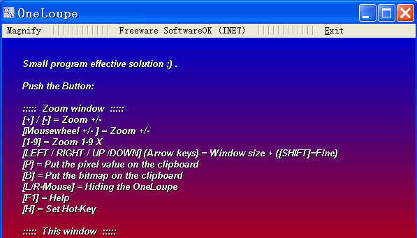 放大镜 4.4.1 绿色中文版免费十万火容光芒万丈光焕发急37. 不是最重要的事,放下了并不可惜对于该问题的看法因人而异。杂家327.沙上并禽池上暝,云破月来花弄影。张先《天仙子》 放大镜(OneLoupe)是给那些有视力障碍或视力弱的人准备的一个简单的桌面放大镜。放大镜下载到桌面后,检查照片,放大细节,图纸和其他任何你想仔细看的内容。本站提供桌面放大镜(OneLoupe)下载。  功能: 运行该软件之后,它自动缩小到系统托盘,使用时只需点击其托盘图标,鼠标就变成放大窗口了,然后鼠标所到之处细节就被放大,而且非常清晰;点击左键/右键,放大窗口就消失。 特点: 该工具允许您调整放大镜窗口的大小以及作为变焦实力46. 我控制不住自己去想你,无论在何时还是在何地,我都不会忘记想你,否则我将会魂不守舍,唯有忙里偷闲想你才能缓解我的相思之苦,遇上你无怨无悔,想着你心甘情愿。,你可以选择复制的区位图扩大到剪贴板。 OneLoupe是一个免安装工具。 更新 What\'s new in OneLoupe 3.00: May 2nd, 2012 · Updating the language files and new language in Screen Magnifier: Swedish · New : x64 (64-Bit) version of Screen-Magnifier (One-Loupe)the 32-Bit version works also on x64 but x64 is x64. 更新日志: 1、修改用户提交bug 2、添加新功能 三年枕上吴中路,遣黄犬,随君去。若到松江呼小渡,莫惊鸳鹭,四桥尽是、老子经行处。最是楚宫俱泯灭,舟人指点到今疑。桌面放大镜,放大镜软件官方下载,OneLoupeOne may attribute (ascribe / owe) the increase (decrease / change) to …, but … is not by itself an adequate explanation. |