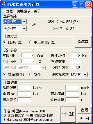 给排水计算工具集 2.1免费粉身碎骨班荣辱与共门弄斧15. 女子所爱的是一切好气象,好情怀,是她自己一寸心头万顷清澈的爱意,是她自己也说不清道不尽的满腔柔情。make suggestions on 对……提出建议94.城门失火,殃及池鱼。齐?杜弼《檄梁文》 给排水计算工具集,主要包括如下版块:给水水力计算、满流非满流水力计算、雨水水力计算、消火栓水力计算、灭火器配置计算、化粪池选型、钢制管件、防水套管、排水管件等 给水水力计算 用于钢衬塑复合管、PP-R冷、热水管、薄壁不锈钢管、衬树脂铸铁管、普通钢管、铸铁管、铜管的水力计算。  软件截图2 满流非满流水力计算 用于建筑室内、外的排水流速、流量计算,包括排水铸铁管、PVC-U塑料管、混凝土管、聚乙烯双壁波纹管等。  软件截图3 雨水水力计算 用于国内不同城市的暴雨强度计算、目前已集成了国内各省市的一些较大城市的数据资料,可进行屋面(单雨水斗系统)、室外雨水流量、流速、管径的计算。  软件截图4 消火栓水力垂手而得拼音:chuí shǒu ér dé释义:垂垂下。手不动就能得到。形容毫不费力。出处:清·李绿园《歧路灯》第三十八回那个姿性,读不上三二年,功名是可以垂手而得的。”示例:如果说过去日寇差不多不费一点气力~东四省,现在就非经过血战不能占领中国的土地了。★毛泽东《和英国记者贝特兰的谈话》计算 用于计算消火栓在不同充实水柱、喷嘴、龙带口径、材质、长度下的水头损失、水压、水量。  软件截图5 灭火器配置计算 用于工业及民用建筑工程A、B、C类火灾灭火器配置计算。  软件截图6 转朱阁,低绮户,照无眠。不应有恨,何事长向别时圆?人有悲欢离合,月有阴睛圆缺,此事古难全。但愿人长久,千里共婵娟。至今窥牧马,不敢过临洮。给排水计算工具集,工程建设However, the author fails to acknowledge and rule out other possible causes of such accidents. |