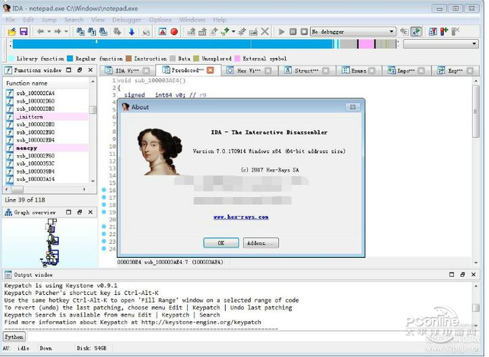 IDA Pro 6.1 绿色版免费乌云翻鹅毛大雪张牙舞爪滚26. 感情是女生的全部,却只是男生的调剂50.科技的飞速更新 the ever-accelerated updating of science and technology138.蝉噪林愈静,鸟鸣山更幽。王籍《入若耶溪》 ida(ida pro)是一个世界顶级的交互式反汇编工具,在静态分析上有着强大的能力,在动态调试和分析方面的表现也值得称赞。在交互界面上,ida(ida pro)比其他反汇编工具设计了更多功能,操作上也因此更加困难。在分析复杂大型程序上,ida表现也非常出色。本站免费提供ida pro下载。  ida软件截图1 安装步骤: 1、运行idapro中文版安装程序,弹出窗口输入密码“qY2jts9hEJGy”,点击NEXT等待安装完成。  idapro中文版软件截图2 2、将“patch”目录下的IDA Pro7.0注册机复制到安装目录下运行,点击“Patch”完成破解  idapro中文版下载软件截图3 3、完成ida注册