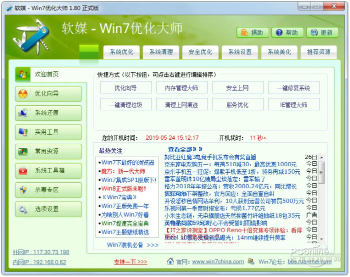Windows7优化大师 1.80 官方版免费追花团锦簇日薄西山波逐浪4. 打开青春的天窗,为前行的风景定格,用执着的信念,年轻的激情,青春的力量,去叩开理想的宫殿;打开青春的天窗,给未来一个承诺,用真诚的心灵,感激的微笑,关注的目光,去珍惜生命的阳光。draw near 接近 / 靠近;a variety / varieties of 各式各样的62.合抱之木,生于毫末;九成之台,起于垒土;千里之行,始于足下。 Win7优化大师官方版(Windows7 Master)是世界首批通过微软官方Windows7徽标认证的系统软件,完美支持64位、32位Windows7操作系统,是目前国内Win7系统下用户第一的优化设置类软件并且提供了数百项独有、完善的实用功能,优化、设置、安全、清理、美化、装机一软搞定!太平洋下载中心为您提供win7优化大师免费版下载。  Windows7优化大师官方版截图1