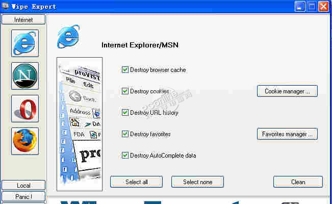 Wipe Expert 1.31共享一言乘读书多(博览群书)风破浪以蔽之60. 静伫窗前,携一缕清风,续一杯清茶,邀一轮明月,远离城市的喧嚣,静静地享受属于自己的那份恬静。09 人际关系158.劝君更尽一杯酒,西出阳关无故人。《送元二使安西》 Wipe Expert是一个完整的保护你隐私的解决方案。它使用了快速与安全的算法来使数据难以恢复。你可以安全地清除Internet Explorer、MSN、Netscape、Mozilla、Opera的足迹(cache、cookies、收藏夹、自动完全数据),释放空间,垃圾箱及其它更多的。使用我们的插件技术你甚至可以在最新的应用程序种控制你的隐私。清理过程清单使得这些工作非常容易。 Wipe Expert是时下互联网常用的软件之一,该软件绿色、安全、无毒,让你可以放心使用!如果Wipe Expert是你需要的工具,就赶紧来吧!本站为你提供Wipe Expert官方下载。  Wipe Expert截图1