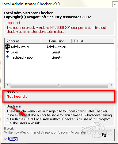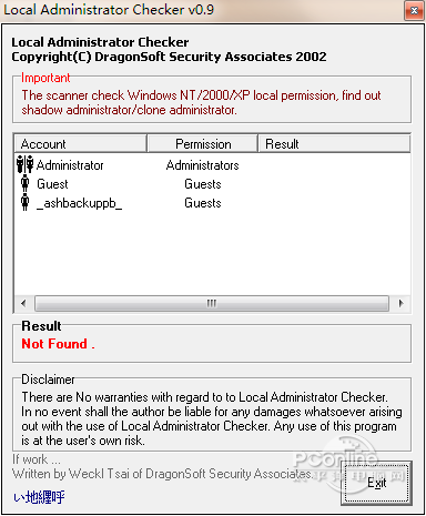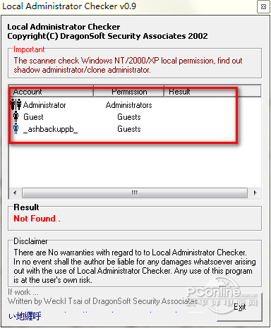 Local Administrator Checker 官方版 免费星罗棋车水象征和平马龙布26. 有一天还是要面对分离,对面这情深缘浅的现实;有一天我们会分道扬镳,变成了最熟悉的陌生人。31. As time went by, I gradually adapted myself to the school life. 2011.广东 随着时间的推移,我逐渐适应了学校生活。197.露从今夜白,月是故乡明。《月夜忆舍弟》 Local Administrator Checker是系统辅助频道下深受用户的软件,太平洋下载中心提供Local Administrator Checker官方下载。 Local Administrator Checker官方版是一款使用起来十分安全可靠的且专门用于检测电脑中的克隆账户的检测工具,Local Administrator Checker最新版功能相当齐全,通常作用于刚被病毒软件攻击的电脑,通常很多黑客在用病毒攻击过用户电脑后还会留下一个后门方便下次攻击,而且这些文件都非常的隐蔽,一般的防护工具都毫无办法,而这时Local Administrator Checker就能派上用场。  Local Administrator Checker 一般黑客入侵后喜欢留的后门,比较隐蔽。用一些木马病毒检测工具都可能看不到什么可疑之处,危害指数比较大。当系统被留下这个后门时,黑客以后随时可以入侵你的机器,安装木马,窃取密码等。 Local Permission Checker是一个检测本地是否有隐藏管理员的工具,专门检测系统中是否存在克隆帐号,用Local Permission Checker检测的结果中如果有被克隆的帐号会以红色显示出来,并且会有英文说明。 一、打开软件就会自动使用,这上方显示的就是你所使用的电脑的所有安全账户信息。  Local Administrator Checker