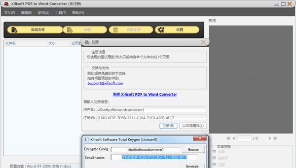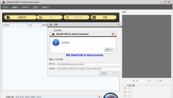 Xilisoft PDF to Word Converter是一款很好用的pdf转换器,它可以将pdf文件转换为Word格式,使用方法非常简单,你只需要选定转换的页面范围和转换后存放的文件位置即可。 ![]() 功能介绍 在没有Adobe Acrobat或Adobe Reader的情况下将PDF文件转换为Word文件 多个输出配置文件:DOC,DOCX,RTF 在缩略图窗口中查看PDF文件 指定要转换的页面 高速转换 将PDF转换成Word:快速,可靠地将PDF转换为原始格式的Word文件 将PDF转换为特定的Word:根据您的Office版本和首选项将PDF文件转换为DOC或DOCX格式的Microsoft Word文件。还支持RTF格式(* .rtf)。 在缩略图中查看源文件:Xilisoft PDF to Word Converter 使您能够以缩略图模式查看源文件并自由翻转页面。 指定转换页面:您可以决定将当前页面上的PDF文件或从一个页面转换为另一页面的PDF文件转换为Word文件。 更多便利功能:后台运行,任务后操作和多语言界面为您提供更多便利 运行后台任务:将转换任务设置为在后台运行,以节省更多的CPU资源并获得更好的性能。 任务后操作:自动退出应用程序,关闭,休眠,在系统旁等待,或者什么都不做,这使您不必在计算机前等待。 多语言界面:多语言接口可供选择,英语,德语,意大利语,西班牙语,法语,日语,简体中文和繁体中文。  软件截图2 软件特色 1、通过2个简单的步骤将PDF文件转换为Word 1)将文件拖放到应用程序。 2)点击“转换”! 2、两种转换模式 在TXT或图片模式下将PDF页面转换为Word。 3、同时转换多个PDF文件 拖放或加载多个文件到应用程序,然后将所有批次一次转换为Word。 4、转换特定的PDF页面 通过从源PDF文件只转换您需要的页面来节省时间。 常见问题 Q:如何变成免费版? 1,从压缩包中找到“keygen.exe”文件并打开  软件截图3 2,点击Browse,从你的安装路径下找到配置文件“pd.cfg”  软件截图4  软件截图5 3,点击Generate获得注册码  软件截图6  软件截图7 4,打开软件,“帮助”→“输入注册码”  软件截图8 5,分别是用户名和注册码,复制粘贴即可,然后点击注册  软件截图9 6,注册成功,说明软件已经变成免费版了  软件截图10 毁不危身拼音:huǐ bù wēi shēn释义:儒家丧制。指居丧哀毁,但不应因此丧生。同毁不灭性”。出处:无示例:无