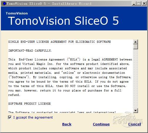Tomovision sliceOmatic 5.0.9 正式版免费过时黄碧空呆若木鸡如洗花3. 青春太好以至于做什么事都觉得浪费。“而我要说:”正因为青春如此好,所以做什么事都不必言悔。在校园内,学生拥有手机的趋势在不断增长。185.文章千古事,得失寸心知。《偶题》 Tomovision sliceOmatic是图像处理频道下深受用户的软件,太平洋下载中心提供Tomovision sliceOmatic官方下载。 Tomovision sliceOmatic最新版是一款专门针对各个地区医院中影像科设计打造的高端实用的图像分析工具。Tomovision sliceOmatic最新版推出大大地简化了工作流程,可以大大地降低工作人员的负担,可以衡量,分割和分析多片扫描仪的数据。Tomovision sliceOmatic它对图像扫描之后,会细分为多块,进行更细致的分析,对于人体身体研究有着巨大的作用。常用于解剖图的分析研究。  Tomovision sliceOmatic 1、常用工具: SliceOmatic具有任何好的图像analisys程序应提供的所有常用工具。这些工具包括在多个窗口中以任何方向查看图像的工具,用于过滤图像的工具,用于测量图像上的距离,角度和表面的工具以及更多的“基本”内容。 2、SliceOmatic的细分: 识别图像内部每个组织的过程称为“分割”。这就是sliceOmatic胜过竞争对手的地方:其细分工具。 sliceOmatic通过高度交互的界面平衡了强大的细分工具,使您能够完全控制细分过程。 &nbs14. 生活中少不了不如意,每每这时不妨想想自己那甜如蜜的爱情、深如海的亲情、醇如酒的友情,拥有这些还不够吗?其实,这些才是自己最坚固的后盾。p; 最好使用不同的技术对同一切片内的不同模态甚至不同组织进行细分。SliceOmatic使您可以轻松地为每个特定任务使用适当的技术。例如,在腹部的MRI切片中,您可能希望使用数学形态学来分割皮下脂肪,并使用区域增长法来分割腹内脂肪。 3、sliceOmatic是一种研究工具: 作为研究人员,分析图像只是达到目的的一种手段。您真正想要的是获得准确的解剖体。SliceOmatic被设计为研究工具。除了帮助您为演示文稿中的这些“哇”幻灯片创建出色的图像外,它还将在电子表格兼容文件中导出每个分割组织的表面和体积。 4、sliceOmatic和生物力学: 也许您的研究领域是生物力学?然后,您将需要使用sliceOmatic从分段数据中创建多边形网格和/或countour线。然后可以将它们导出为多种标准格式,以用于有限元analisys或创建立体光刻模型。 5、灵活性: sliceOmatic支持的多种格式使其成为查看和分析所有图像的理想工具。您可以看到 支持的图像格式列表。 1、为您提供了最佳的分割过程 2、切片法,这是一种针对医学图像领域的专业人员的高级应用程序,可以执行人体组成和三维解剖结构建模 3、支持最流行的医学图像格式 4、允许您将单个或多个文件加载到应用程序中 5、提供的“工具”帮助您拍摄快照,查看2D像素信息,执行3D阴影操作,以及许多其他任务 1、双击“sliceOmatic 5.0 Rev-9.exe”开始加载安装包  Tomovision sliceOmatic 2、然后进入到sliceOmatic的安装向导界面,点击继续  Tomovision sliceOmatic 3、出现软件的许可协议,选择i accept