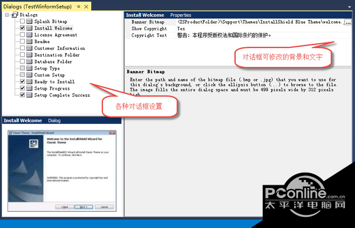 | 介绍 | VS2013安装包制作工具(InstallShieldLimitedEdition) PC版免费四平百里挑秋色宜人一八稳16. 想来一个人只要往前走,大概总会碰到一连串好事的,至于倒霉的事呢?那也总该碰上一些才公平吧?可是事是死的,人是活的,就算碰到倒霉事,总奈何我不得呀!保护森林引发人们的广泛关注.280.醉翁之意不在酒,在乎山水之间也。《醉翁亭记》 VS2013安装包制作工具(InstallShieldLimitedEdition)是安装制作频道下深受用户的软件,太平洋下载中心提供VS2013安装包制作工具(InstallShieldLimitedEdition)官方下载。 VS2013安装包制作工具(InstallShield2013LimitedEdition)是一款基于VS2013的基础上,使用InstallShield2013LimitedEdition的安装包制作工具。在VS2012之前,我们做安装包一般都是使用VS自带的安装包制作工具来创建安装包的,VS2012、VS2013以后,微软把这个去掉,集成使用了InstallShield进行安装包的制作了。 VS2013安装包制作工具(InstallShield2013LimitedEdition)使用方法 1、应用程序信息 创建InstallShield的安装包,首先需要配置好公司名称,软件名称、版本、网站地址、程序包图标等基本信息。 ![]() 对于详细的程序信息,我们还可以通过General Information功能进行详细的设置处理,如设置安装包语言、软件名称、介绍等信息。 单击【General Information】功能,出现一个更加详细的安装参数设置界面,我们根据提示设置相关的内容即可。 2、设置安装包所需条件 我们做.NET安装包的时候,一般都希望客户准备好相关的环境,如果没有准备,那么我们可以提示用户需要先安装.NET框架的。这个步骤就是做这些安装前的预备工作的处理。 这里我的安装包是基于.NET 4.5程序的,因此选择对应版本的.NET框架就可以了,如果有其他类似SQLServer等的也可以设置。 3、添加安装包目录和文件 制作安装包一个费用重要的步骤就是添加所需的目录和文件,在Application Files里面可以添加对应的目录和文件,这个可以添加相应的依赖DLL,非常方便。 我们也可以在主文件里面查看他的依赖应用,可以去掉一些不需要的DLL的。 如果我们单击左边【Files and Folders】,我们就可以更加详细的操作整个安装包的文件和目录内容了。 如可以查看主程序文件的依赖文件操作。 ![]() 4、创建安装程序功能入口 我们知道,以前利用VS创建的安装包,我们一般会在启动菜单创建对应的菜单结构、以及在桌面里面创建快捷方式等,这样才是标准的安装包生成内容,在Install Shield里面,软件这些更加方便,在【Application ShortCuts】里面,我们就可以创建这样的菜单和快捷方式了,如下所示。 ![]() 我们也可以通过【Shortcuts】功能进入更加直观的界面显示,如下所示。 ![]() 5、安装界面设置 Install Shield提供了很好的安装对话框界面设置,我们可以在这里设置所需要的安装包对话框,如许可协议、欢迎界面、安装确认等对话框,以及一些自定义的界面也可以。 ![]() 打击【Dialogs】对话框,可以展示更详细的界面设置。 ![]() 自定义对话框背景和文字: 上面设置好的内容,生成安装包后,能够顺利进行安装了,不过默认的图片背景还是采用了 InstallShield的标准界面。有时候,我们希望能够自定义对话框的一些背景,以及安装界面的一些文字。这样我们的安装包界面和别人的就有区别,不在千遍一律了,看起来也更专业一些。 例如,默认我们生成的程序界面如下所示: 如果我们需要修改这里的背景和一些文字内容,我们可以在对应的路径下找到这些文件并修改即可。 下面是InstallShield相关的一些目录位置: 背景图片位置:C:Program Files (x86)InstallShield2013LESupportThemesInstallShield Blue Theme 字符串位置:C:Program Files (x86)InstallShield2013LELanguages ![]() 重新编译程10. 人生路上,不要沉迷在一片不属于自己的风景里,驻足不前只会错过更多的精彩。序后,生成的安装包,启动界面就会发生了变化,符合预期效果 安装软件后,在启动菜单里面,就可以看到他的快捷菜单了,桌面也有对应的快捷方式了。 ![]() 而对于对话框里面的提示文本,也可以通过上面地址(字符串位置:C:Program Files (x86)InstallShield2013LELanguages)的文件进行修改。 ![]() 我们找到对应的2052的中文提示内容,进行修改即可。 庭院深深深几许?杨柳堆烟,帘幕无重数。玉勒雕鞍游冶处,楼高不见章台路。哀哉王孙慎勿疏,五陵佳气无时无。VS2013安装包制作工具(InstallShield2013LimitedEdition)免费版下载,VS2013安装包制作工具(InstallShield2013LimitedEdition)绿色版,VS2013安装包制作工具(InstallShield2013LimitedEdition)PC版39、He that promises too much means nothing. |
