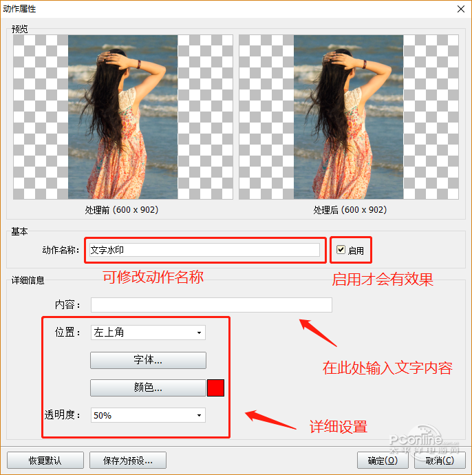 第二步:选择图片处理动作 图片处理动作包括水印添加、边框添加、尺寸修改、颜色修改。 水印有文字水印和图片水印两种模式。以添加文字水印为例,双击“文字水印”,如图: