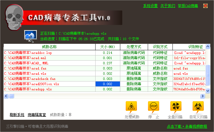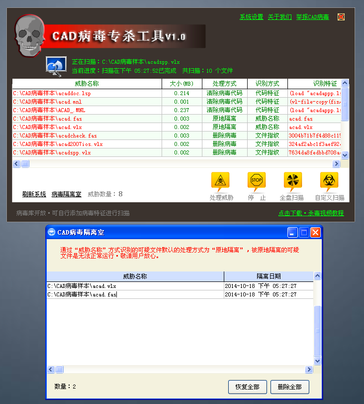 620CAD病毒专杀工具 1.0 官方免费版免费鸟语蝉鸣莺歌门庭若市燕舞29. 爱心是风,卷起浓密的云;爱心是云,化作及时的雨;爱心是雨,滋润干旱的树;爱心是树,撑起一片绿荫。10 节假日活动184.此曲只应天上有,人间能得几回闻。《赠花卿》 620CAD病毒专杀工具专查杀CAD病毒、隔离病毒文件、清除被感染文件中的病毒,使其恢复正常;病毒库开放,针对未知或主流杀软无法识别的病毒、可疑文件时,用户可自行提取并添加其病毒特征到病毒库中立刻进行查杀。 使用说明: 查找cad病毒  删除病毒  软件截图2 620CAD病毒专杀工具是时下互联网常用的软件之一,该软件绿色、安全、无毒,让你可以放心使用!如果620CAD病毒专杀工具是你需要的工具,就赶紧来吧!本站为你提供620CAD病毒专杀工具官方下载。 27. 失恋首先是一种幸运,其次才是不幸。失恋,证明我们真正的爱过了。如果没有的话。也就无所谓失恋。那些三天两头喊失恋的人,肯定是不会用多少真情的。
