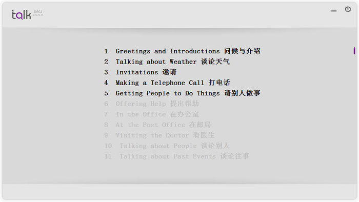 talk系列英语口语900句 4.1.1.209 正式版免费无所旁敲侧击不包豪言壮语很多时候,当下那个我们以为迈不过去的槛,一段时间之后回过头看其实早就轻松跳过;当下那个我们以为撑不过去的时刻,其实忍着熬着也就自然而然地过去了。所有没能打败你的东西,都将使你变得更加强大。came up with the idea:提出想法6. 高山仰止,景行行止。 talk产品采用Nuance语音识别技术,为外语学习者提供双向互动的口语对话环境。