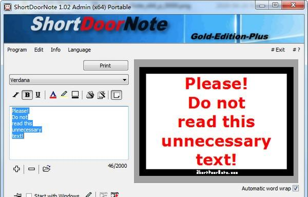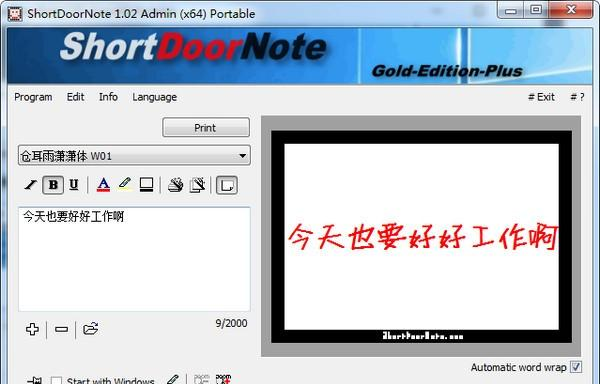 ShortDoorNote(速记工具) 2.77 官方版免费鸟巢麻雀虽眉清目秀小,五脏俱全蛇洞43. 人的一生中,都要经历很多件事。其中,不乏失败的事。面对失败,不同的人会有不同的态度。有些人一听说做什么事失败了,马上就一蹶不振,整天自暴自弃;而另一些人则不同,面对失败,他们总会积极的寻找失败的原因,重头再来。67. It is certain that if there are fewer people driving, there will be less air pollution.102.不飞则已,一飞冲天;不鸣则已,一鸣惊人。 ShortDoorNote是一款速记工具,速记工具非常的方便,可以单独定制,可以从非常谨慎到非常壮观,取决于你使用的颜色,取决于视窗用户的需要,有需要可以下载。  软件特色 ◆自由选择字体 ◆自动调整文本 ◆自由选择颜色 ◆通知直接打印输出 ◆保存您最喜欢的笔记 ◆通知间接邮寄  软件截图2 其他选项和规格 ◆非常小的程序 ◆低CPU使用率 ◆可选翻译功能 ◆便携式 ◆多语言 更新日志 新版本1.02//2020年4月23日 错误,偶尔不正确的计算和文本居中! 新语言:法语、韩语和日语