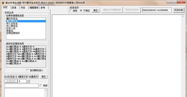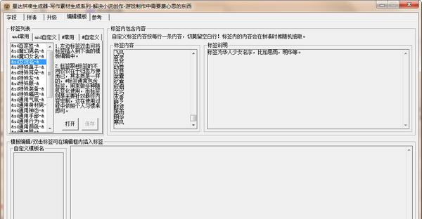 星达拼凑生成器 1.0 绿色版免费高山龙马精娓娓动听神深涧50. 日子总是像从指尖渡过的细纱,在不经意间悄然滑落。那些往日的忧愁和误用伤,在似水流年的荡涤下随波轻轻地逝去,而留下的欢乐和笑靥就在记忆深处历久弥新。43. I have fully realized that English is essential to my future.262.溪云初起日沉阁,山雨欲来风满楼。许浑《咸阳城东楼》 星达拼凑生成器是一款小说、游戏、脚本的剧情模型编辑器,通过星达拼凑生成器用户可以不用绞尽脑汁的去想如何生成素材,仅需要几个字段就能生成一个完整的充满逻辑的字段,星达拼凑生成器几乎可以适用于所有文字类的创作工具中,是一款非常好用的软件。  软件特色 1、自由自定义模板化 用户根据自己的需求来自定义模板,自由度高,如简单的名字生成,则是两个标签组成,【姓】+【名】,如果用户在该组合后面加上一个“先生”,则生成内容是名字+先生,用户可以通过随意调配标签组合来使其产生完全不同 性质的变化。 2、严谨的逻辑关系 比如机器人的设定模板,包括的标签很多,比如机器人的身高,体重,装备的装置,根据身高体重产生其他内容生成,就通过因果关系来产生,如身高10米的机器人装备15米火箭炮,因为确认身高有10米,才调用了15米火箭炮标签,这就让内容产生合理化,同样的,通过很多因果关联,让模板生成内容符合物理原则,甚至让模板产生科学实验的生成结果。 3、超强的复合标签变化 模板中的任意标签都是自定义的,当然也有从内部标签库里直接调出的,不同的标签可以进行复合组合,比如标签A内包含标签B,标签B内包含了标签C,D,这样的模式可以让标签变化产生难以预测的结果,从而使得一个几百K大小的模板,产生数万兆亿次的不重复变化,超高的变化带来的就是电脑模拟原创的效果。 4、涉及所有文字领域 网络写作用户用于定制自己的小说脚本模板,大纲模板,灵感模板,设定模板,描写模板。代写业务用户用于定制各种代写类项目模板,设计文案类用户用于制作方案模板,只要是文字领域有比较固定类需求的都适合使用模板进行合理搭配。 使用方法 一、下载软件打开,进入字段拼凑功能模块,通过这个功能用户能够自由的拼凑小说捶床拍枕拼音:chuí chuáng pāi zhěn释义:形容辗转难以入睡。同捶床捣枕”。出处:清·曾朴《孽海花》第三回他脾气越发坏了,不是捶床拍枕,就是咒天骂地。”示例:无中诸如人的名字,装备的名字,一些玄幻装备道具的名字。  软件截图2 二、在人物属性值界面可以对一些基础属性进行随机排列,多用于游戏中对怪物血量的随机生成。  软件截图3 三、在标签功能模块中,用户可以自定义一些模块加入,这样就可以再写作的时候拼凑出来。  软件截图4 乳燕飞华屋。悄无人、桐阴转午,晚凉新浴。手弄生绡白团扇,扇手一时似玉。渐困倚、孤眠清熟。帘外谁来推绣户?枉教人梦断瑶台曲。又却是,风敲竹。锦城虽云乐,不如早还家。星达拼凑生成器,星达拼凑生成器下载,文本处理,应用工具63、Clumsy birds have to start flying early. |