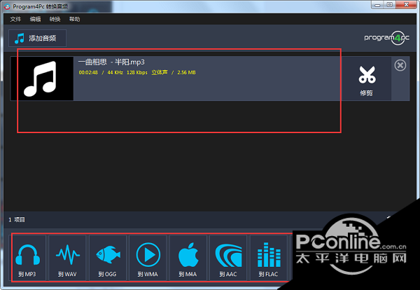 2、这个就是音频转换的功能,下方是输出的格式选择,上方是转换音频的文件添加地址