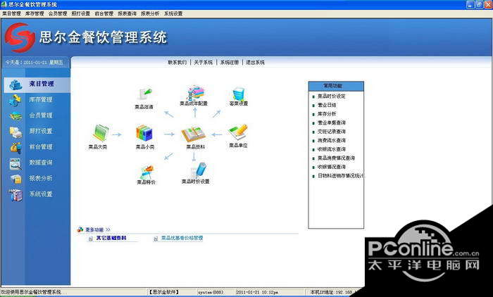 此版为全功能版本,是一套综合性的餐饮管理系统,可适用于各种规模的餐饮娱乐企业,如餐厅、酒楼、茶楼、歌舞厅、夜总会、酒吧、咖啡厅、快餐店等等。支持的硬件设备: 无线 点菜器、触摸屏、会员读卡器、短信猫、来电通、厨房打印机等。软件由六大模块组成:前台、后台、厨打监控、来电预订、点菜宝监控、 触摸屏系统。