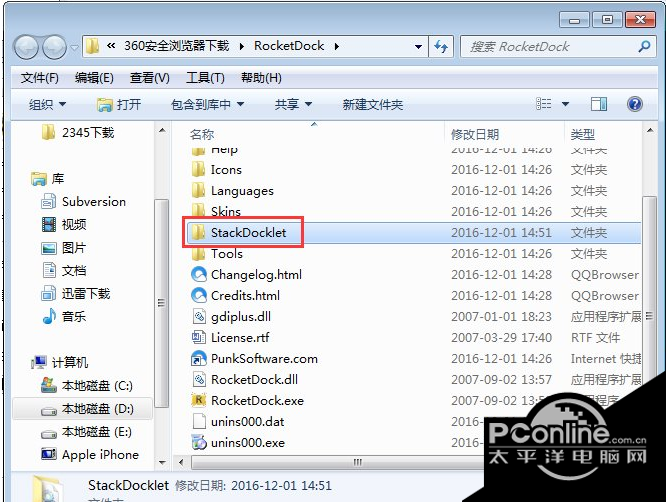 6、我们就可以进入到RocketDock软件的安装位置,如下图所示,接下来我们在将下载的StackDocklet插件复制到RocketDock软件的安装位置中,复制完成后在进行下一步。