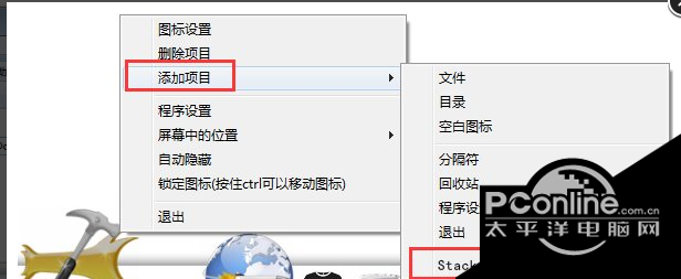 7、接下来我们回到桌面的DOCK栏,鼠标右键点击后在弹出的菜单栏中点击“添加项目”选项,然后在右侧的选项中再点击StackDocklet。这样桌面上就可以出现一个StackDocklet图标。