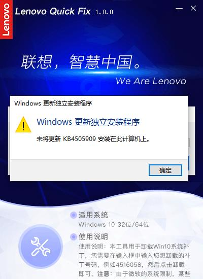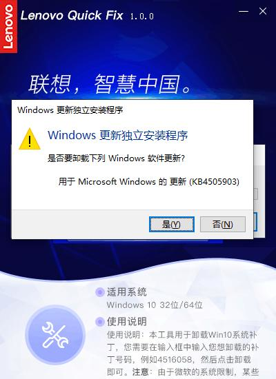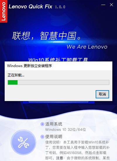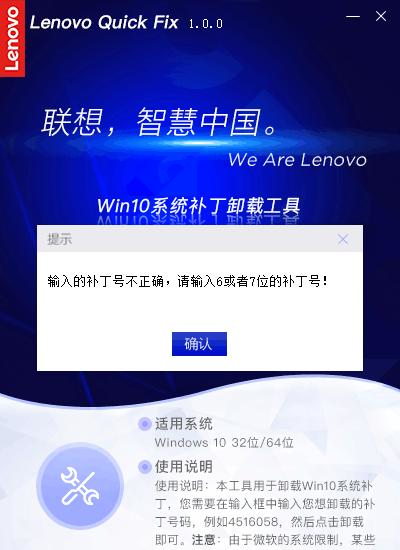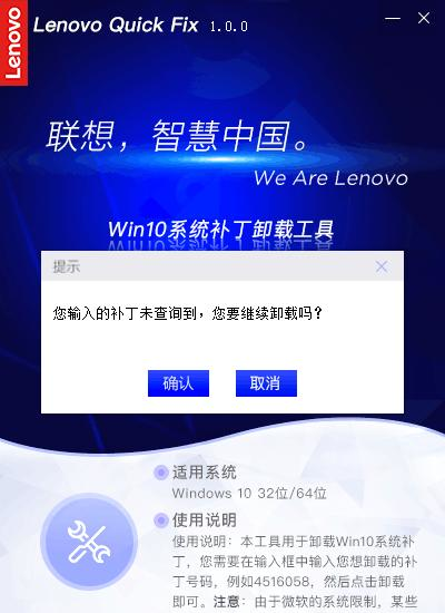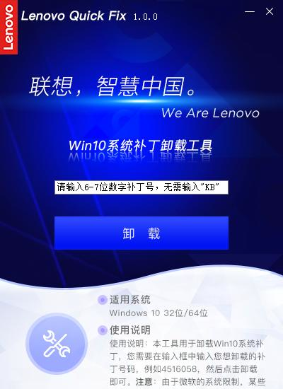 Win10系统补丁卸载工具 1.0.0 官方版免费五一花团锦簇干二净花八门16. 爱情没了,生活一样在继续。爱是种责任,如果你真的爱,请不要轻易说放弃,那不止会伤害别人,同样也会伤害你自己。对未来的承诺,如果你没有把握实现它,那么,请你也不要给我任何承诺,因为,我会当真。我们无法想象没有纯净的水,这个世界会变成生么样子。101.大行不顾细谨,大礼不辞小让。 Win10系统补丁卸载工具是一款系统辅助工具,用于卸载Win10系统补丁,您需要在输入框中输入您想卸载的补丁号码,然后点击卸载即可。使用非常方便,有需要可以下载。  使用方法 步骤一:双击运行“Win10系统补丁卸载工具.EXE”,可能出现的用户账户控制提示,请选择“是”。  软件截图2 Win10系统补丁卸载工具操作首页。  软件截图3 步骤二:输入6位或7位的补丁号码,点击“卸载”,工具开始查询系统内是否有该项补丁,查到该补丁后会弹出提示信息。  软件截图4 若输入的补丁号不正确,工具则弹出提醒信息,(输入6位或者7位数字的补丁号,无需输入KB)。  软件截图5 在查询到补丁后,点击“确认”工具将调用Windows命令,提示“是否要卸载……”的确认信息。  软件截图6 点击“是”,则开始执行卸载。  软件截图7 卸载成功后工具提醒操作完成的信息。  软件截图8 另外,有些补丁使用工具查询不到时也可以继续卸载  软件截图9 点击“确认”后调用Windows命令执行搜索和卸载,若查询到该补丁则可以继续卸载,若系统内不存在该补丁,将会弹出相关提醒信息  软件截图10 最后,在操作完成后点击工具操作页右上方的X可关闭该工具。 22. 失恋算个啥?轻轻的,你走吧,千万别后悔,因为只要你一挥手,就会发现,已经有那等不及的意中人,正偷偷摸摸地拉俺的手!
