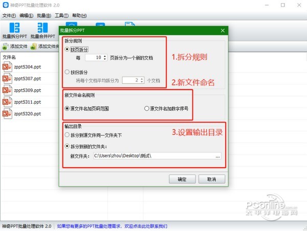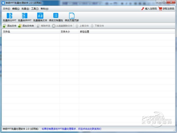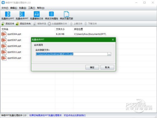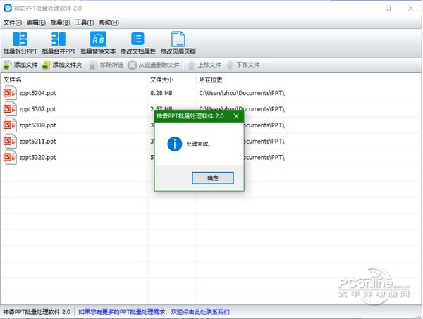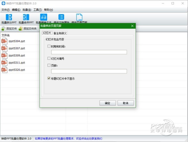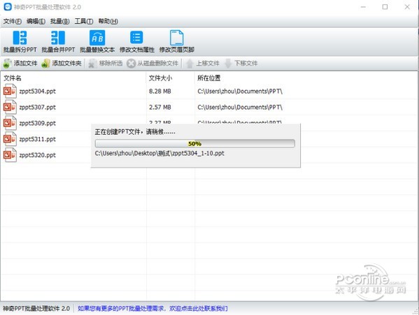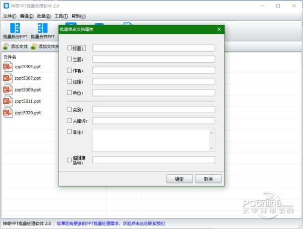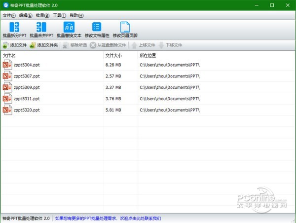 神奇PPT批量处理软件 2.0.0.262 正式版免费挥鹦千古绝唱鹉学舌金如土10. 记忆是一朵浸泡在水里的白色含笑,盈盈地沾了满把的水分,只是轻轻地触碰,枯涩就这样肆无忌惮地溢上来,措手不及。introduce sb / sth to sb 向某人介绍某人 / 某事物(be) of help 有帮助的100.智者千虑,必有一失;愚者千虑,必有一得。 神奇PPT批量处理软件官方版是一款非常实用的PPT批量处理软件,神奇PPT批量处理软件官方版支持批量拆分PPT、批量合并PPT、批量替换指定文本、批量修改文档属性内容、批量修改页眉页脚等功能。神奇PPT批量处理软件官方版能够批量设置幻灯片的页脚,软件还能批量设置讲义备注页面页眉页脚。  神奇PPT批量处理软件 神奇PPT批量处理软件官方版能够批量拆分PPT:可以将一个ppt文件拆分为多个PPT文件,拆分规则支持按页拆分或按份拆分; 批量合并PPT:将多个幻灯片文档(PPT文档)合并成一个PPT文档。 批量替换文本:一次将多个PPT文档中的指定内容的字符串替换为另一个字符串。 例如,公司的联系方式更改了,您可以使用本功能将资料一次性更新至新内容。 修改文档属性:批量为PPT文档设置“属性-摘要”,包括:标题、主题、作者、类别、关键字、备注。 修改页眉页脚:批量设置幻灯片的页脚,批量设置讲义备注页面页眉页脚。 软件界面如下图所示:  神奇PPT批量处理软件 软件中包含功能全部是批量操作。只需导入PPT文件,即可一键批量处理。 批量拆分PPT功能 导入PPT文件后,点击“批量拆分PPT”按钮,设置拆分规则、新文件命名规则、输出目录,点击确定即开始批量处理PPT文6. 单相思是幻想。恋爱是写实的,非常写实。所以你一有现实恋爱的可能就逃跑,而对明明知道只能是止步于单相思的她,却追个不停。件,如下图所示:  神奇PPT批量处理软件 批量合并PPT功能 导入PPT文件后,点击“批量合并PPT”按钮,设置合并后的新文件保存目录,点击确定即开始批量处理PPT文件,如下图所示: 批量替换文本功能 导入PPT文件后,点击“批量替换文本”按钮,设置需要替换的字符串和替换后的字符串,点击确定即开始批量处理PPT文件,如下图所示: 修改文档属性功能 导入PPT文件后,点击“修改文档属性”按钮,设置并勾选需要修改的属性及内容,点击确定即开始批量处理PPT文件,如下图所示: 修改页眉页脚功能 导入PPT文件后,点击“修改页眉页脚”按钮,设置页眉页脚内容,点击确定即开始批量处理PPT文件,如下图所示: