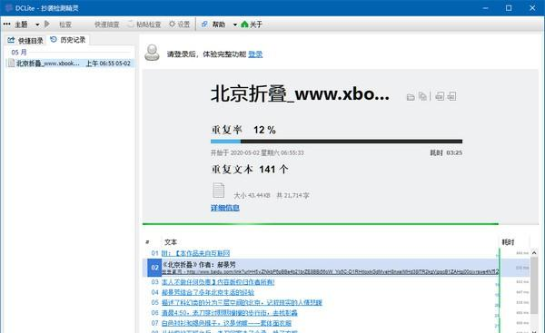 抄袭检测精灵DC Lite 2.0.2.0 官方版免费高瞻乌云翻人如潮涌滚远瞩19. 身在红尘,错过多少缘分如流,看过多少聚散随风,到最后都成一场无法圆满的修行,归于清寂。染香岁月的文字,清远,绵长。喜欢这种素雅清新的感觉,浅浅的云,微微的风,垂眸一朵花的艳,轻嗅细细的香。还有什么比着春天的味道更美,更香!57. I have such a good command of English that I am elected as assistant to my English teacher.(2015.陕西)220.回眸一笑百媚生,六宫粉黛无颜色。《长恨歌》 DC Lite是一款基于搜索引擎的轻量文档抄袭检测,小说查重软件。由早期的DoCheck重构改版而来,优化了检测流程,提升了检测速度和准确性。有需要可以下载。  软件特色 * 支持多个搜索引擎(百度、搜狗、必应、360、谷歌) * 支持复制粘贴直接搜索 * 搜索结果可直接复制,且支持导出为文本、网页 * 提供快捷目录、历史记录便于快速定位工作目录及回顾文档检查历史  软件截图2  软件截图3  软件截图4  软件截图5 更新日志 增加 抄袭提示(勾选后设置最低重复比例,超过该重复比例的文档将在检查后弹出“抄袭”提示) 修改 “关于”界面为弹出窗口 修正 【网址过滤】未完全生效的问题 增加 增加更多默认过滤规则(百度地图,百度图片,百度翻译等) 修改 安装包默认安装位置调整到用户目录(%appdata%) 满眼游丝兼落絮,红杏开时,一霎清明雨。浓睡觉来莺乱语,惊残好梦无寻处。江上月明胡雁过,淮南木落楚山多。抄袭检测精灵DC,Lite,抄袭检测精灵DC,Lite下载,文本处理,应用工具31、Walls have ears. |