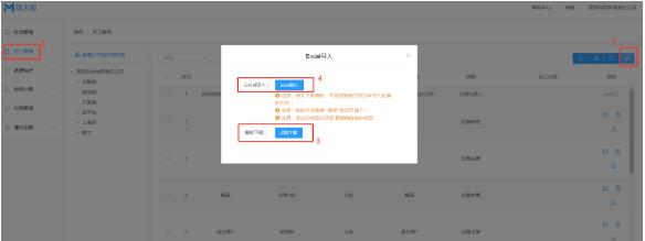 软件截图5 5.模板填写完毕之后保存一下,然后返回后台点击excel上传,选择文件然后导入,导入成功之后会有对应的提示,导入错误的账号会提示错误的原因,错误账号修改后单独上传即可。 如何批量导入员工 1.在左端导航栏打开“员工管理”页面,点击右上角“Excel导入”,进入“Excel导入”页面。