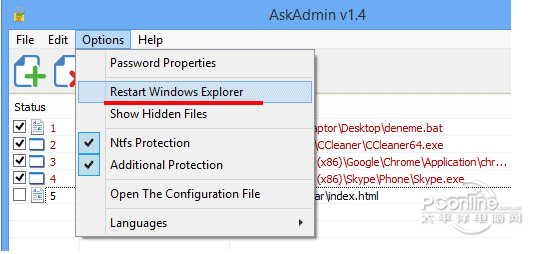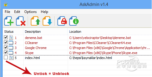 AskAdmin 1.6 正式版免费临危不《水顶天立地浒》惧情感,在梦幻意境里淡看,释怀,安静,人无千日好,花无百日红,完美永存于臆念,不存于现实。21. I’m looking forward to your reply even your appearance in our training center soon.(2017.全国Ⅱ卷)316.读书千遍,其义自见。《熟读精思》 AskAdmin是优化设置频道下深受用户的软件,太平洋下载中心提供AskAdmin官方下载。 AskAdmin免费版是一款可以限制电脑安装软件的工具,AskAdmin免费版功能非常的实用,可以修改指定的文件扩展名。能有效的保护文件和系统安全。  AskAdmin 使用方法 1、最简单的方法是拖放你想阻止对AskAdmin窗口的应用程序。如果你愿意,你可以将多个应用程序窗口一次。 2、单击“添加文件”按钮,浏览到要添加应用程序。 3、如何阻止应用程序 要阻止一个应用程序,在方框里打勾其名称旁边。(添加到列表中的程序在默认情况下阻止)。请注意,如果你不小心挡住,导致系统不稳定Windows系统文件,则需要重新启动电脑进入安全模式,并解除它。 4、如何解除阻止应用程序 可以解除阻塞某个应用程序,或者你可以同时解锁选择了所有阻止的应用程序或只的人。  AskAdmin 1)取消勾选旁边的应用程序名称框 b)删除应用程序的名称(编辑菜单- >删除,或者在应用程序右键单击并选择删除)  AskAdmin 如果阻止看起来并不奏效,你可能需要重新启动Windows资源管理器。要做到这一点,单击选项菜单,然后选择“重新启动Windows资源管理器” AskAdmin免费版使用哈希安全方法,因此它是无用的人试图通过重命名应用程序文件名来规避块。的限制不能用GPEDIT.MSC或通过任何其它方法被打破。 5、您可以保存(出口)禁令名单 如果你已经创建了一个包含许多应用程序的块列表,您可能希望保存列表供以后使用。为了便于操作,请单击“保存列表”按钮。 6、您可以加载(进口)禁止清单中 轻松还原您的保存禁止列表中,单击“加载列表”按钮。 注:如果您使用AskAdmin的“重新启动Windows资源管理器”(在选项菜单),Windows资源管理器将具有管理权限的推出(上NT6系统,如果启用UAC)
