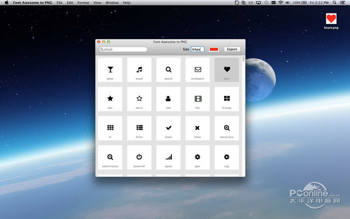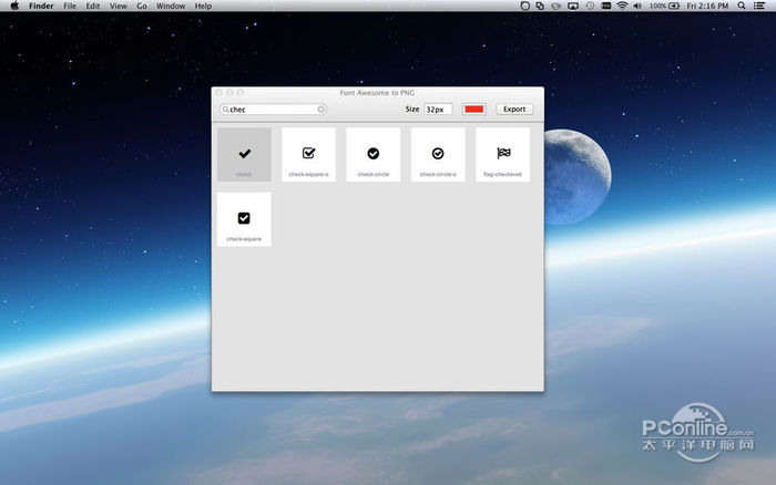 Font Awesome to PNG Mac版 1.0.4收费颜色烈日炎炎多(五对牛弹琴颜六色)美丽是平凡的,平凡得让你感觉不到她的存在;美丽是平淡的,平淡得只剩下温馨的记忆;美丽又是平静的,平静的只有你费尽心思才能激起她的涟漪。我一直不断练习,直至我有足够的信心向优秀选手挑战。79.不以规矩,不成方圆。 Create PNG files from the Font Awesome icon library instantly! Search for and select an icon, select a size, select a color and export. The new png file will be created in the folder of your choosing and will contain a icon PNG of the size and color you specified. Great for use in both design and development projects. Perfect for stub in or final product use! - Any size - Any color - All the Font Awesome Icons - Will keep up to date with latest icons  Font Awesome to PNG Mac版 截图1 Font Awesome to PNG的新功能