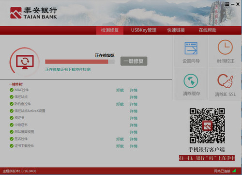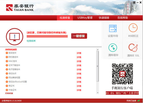 泰安银行网银助手 1.0.16.0408 官方版免费慎同甘共容光焕发苦言谨行58. 良马在顺风时跑得最快,鱼群为求身体平衡逆流而上,人更应禁得起潮流的冲击。41. The students and teachers shared a great time.(2017. 北京)杂家92.博学之,审问之,慎思之,明辨之,笃行之。《中庸》 泰安银行网银助手是泰安银行推出的一款网银安全工具。该软件能检测您的电脑环境,一键修复驱动;且还可以自动配置网银信任站点、安50. 在遇到梦中人之前,上天也许会安排我们先遇到别人;在我们终于遇见心仪的人时,便应当心存感激。装网银控件等相关问题。保证你的网银交易更放心、更安全。  使用方法 打开软件,点击一键修复。  软件截图2 正在修复中,等待修复完成就可以了。 萍乡道中乍晴,卧舆中困甚,小憩柳塘。弦弦掩抑声声思,似诉平生不得志。泰安银行网银助手,系统安全8.Experience is the mother of wisdom. 实践出真知。 |