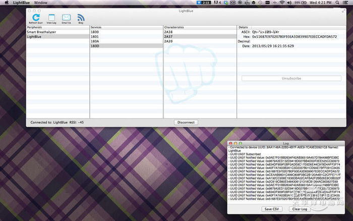 LightBlue Mac版 1.2免费秋色自一日千里我陶醉迷人36. 用心人生看到的世界是一片阳光,消极人生看到的世界是一片黑暗;用心人生感受到的生活是无比快乐,消极人生心里感觉到的仅是一丝丝悲凉。take immediate actions 立即采取行动;better vt. 改善335.近水楼台先得月,向阳花木易为春。俞文豹《清夜录》 LightBlue can test all of your devices that use Bluetooth 4.0 Low Energy (also known as Bluetooth Smart, or Bluetooth Light). Full support of read, write, and notify is included. Use this to test your new BLE Heart Rate Monitor, temperature sensor, TI CC2540 Keyfob, Nordic uBlue, Panasonic PAN1720, etc. Developers can use LightBlue to test the hardware or firmware of their BTLE peripherals. Key Features: - Scan for any peripherals - Br8. 我不敢说我是,世界上最爱你的人,但我敢说你是我最用心爱的人。owse Characteristics and Services - Register for Notifications - Read Services - Write Services in Hex or Ascii  LightBlue Mac版 截图1 LightBlue的新功能