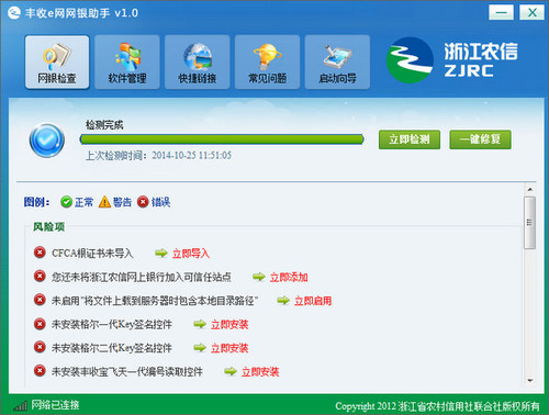 丰收e网网银助手是浙江省农村信用社(合作银行、商业银行)推出的一款网银工具,通过下载并安装丰收e网网银助手,点击“一键修复”按钮,使您的电脑达到使用网银所需的最优环境配置。  使用方法 第一步:下载安装丰收e网网银助手 请下载安装丰收e网网银助手,该软件将引导您完成整个丰收宝驱动、控件的安装。 第一次使用丰收e网网银助手的用户运行安装包后,请选择对应的安装版本和丰收宝驱动类型。  软件截图2 建议专业版用户安装网银助手时将丰收宝插入电脑,网银助手将为您自动选择驱动类型。 第二步:网银检测,一键修复 安装完成后,网银助手将自动进行网银检查,或您可点击“立即检测”按钮再次检测您的计算机设置。 检测完成后,请点击“一键修复”,或根据风险项的提示逐项修复,使您的电脑达到使用丰收e网的最优环境。  软件截图3 通过以上的步骤,恭喜您已经完成了丰收e网网上银行的系统设置。在使用丰收e网网上银行的过程中,您可随时通过网银助手进行检测并一键修复。您还可以在网银助手“软件管理”菜单内,分别安装控件、驱动程序,调整您的计算机设置。 秋千院落重帘暮,彩笔闲来题绣户。墙头丹杏雨馀花,门外绿杨风后絮。鸾翔凤翥众仙下,珊瑚碧树交枝柯。丰收e网网银助手,系统安全When half the population goes to college, one cannot expect the colleges to maintain the same standards as in countries where only the elite attend. |